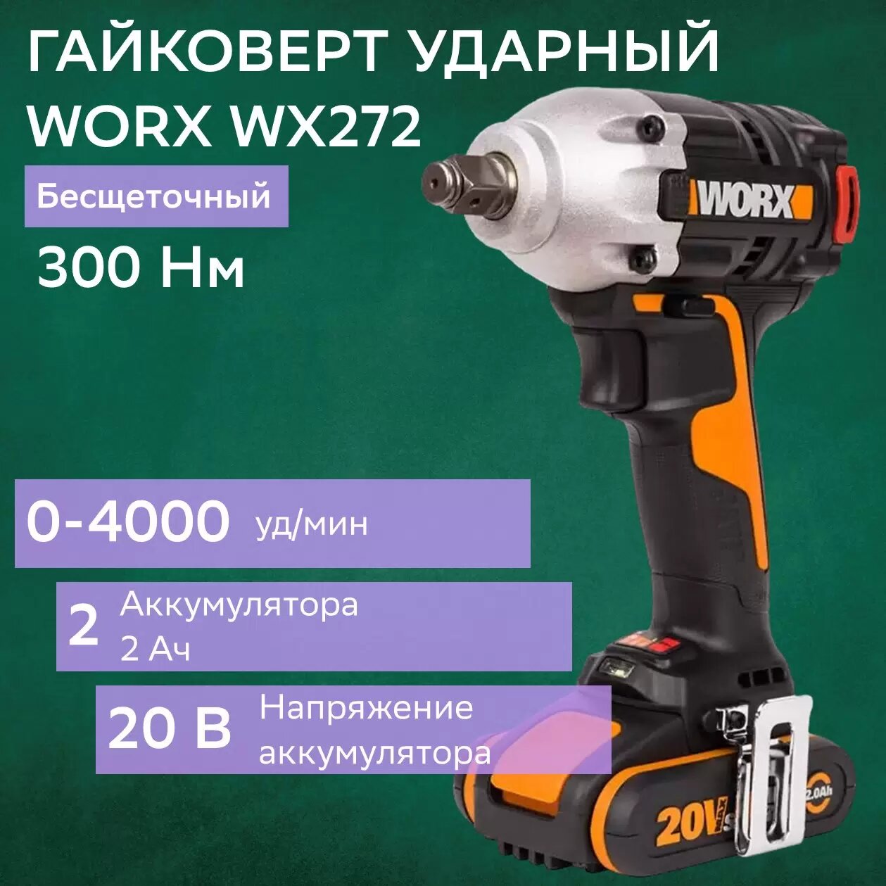 Гайковерт WORX WX272 20V бесщеточный аккумуляторный с двумя 2Ач батареями, 2А зарядкой и кейсом