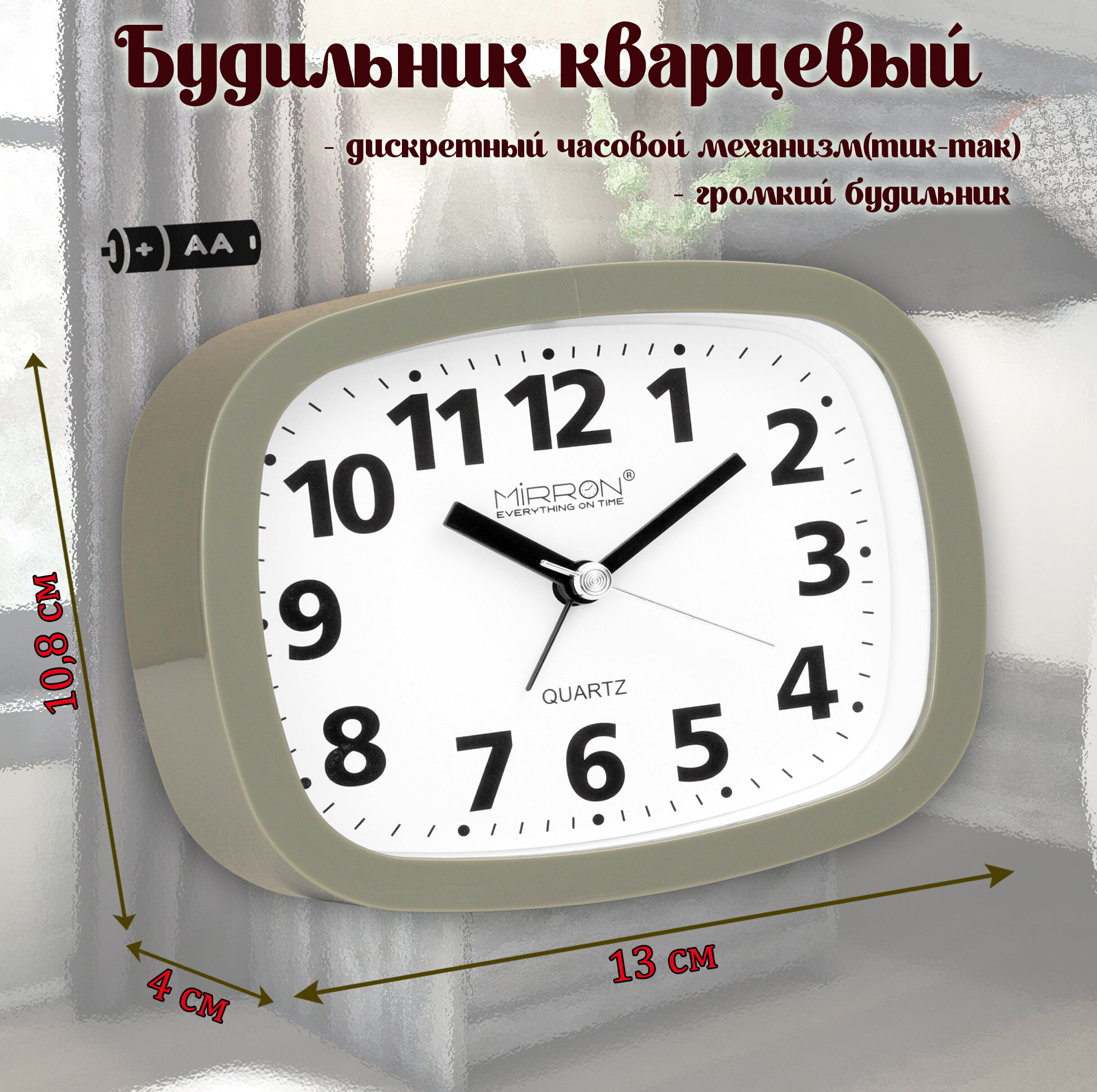 Купить Серый будильник MIRRON 8342 С/Хаки цвет корпуса/Белый (светлый) циферблат/Часы на тумбочку/Будильник в детскую комнату/Будильник в спальню/Классический, обычный будильник