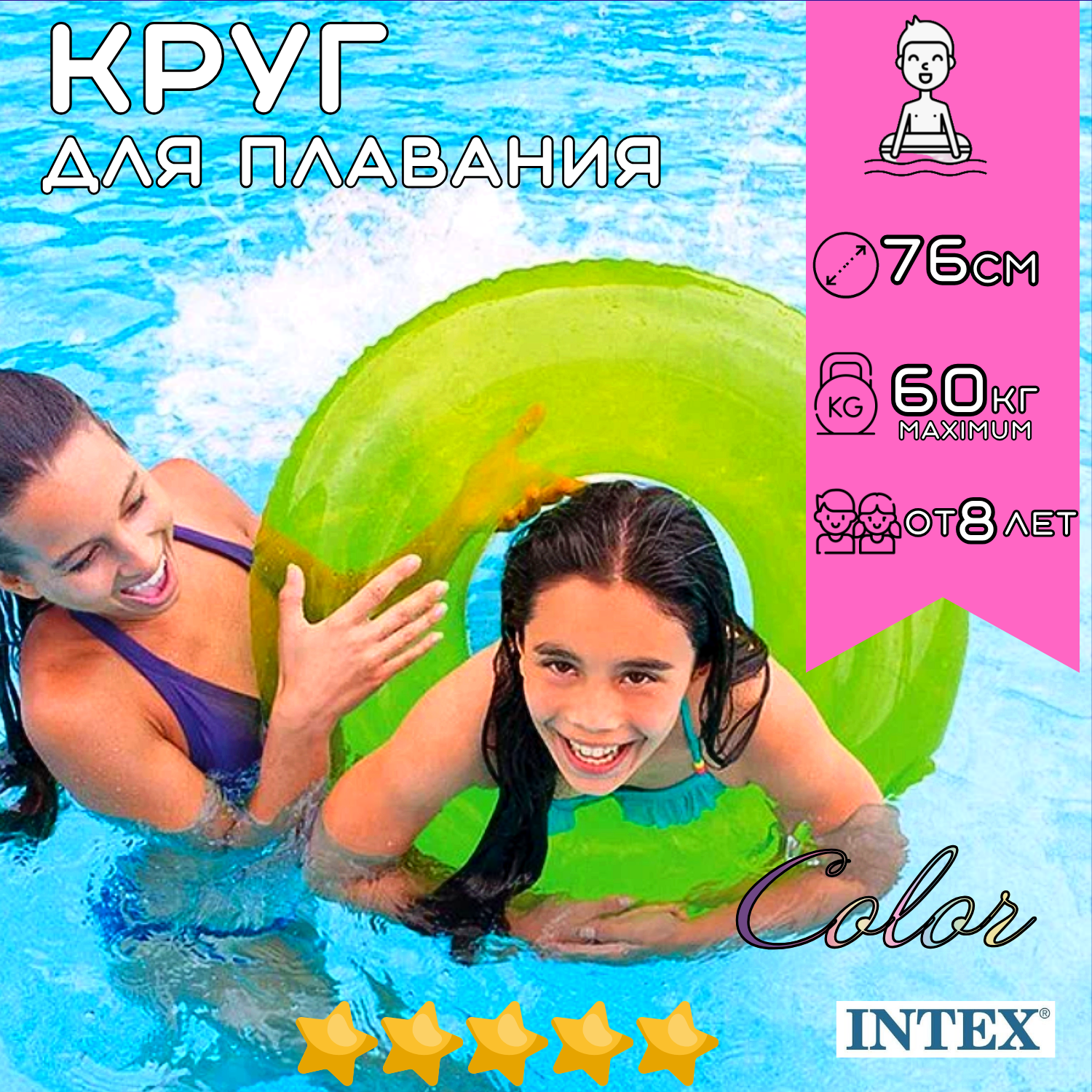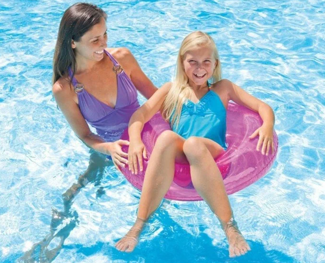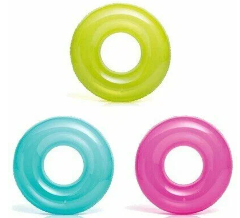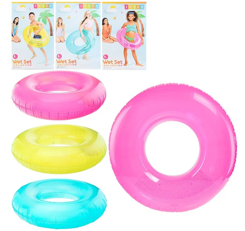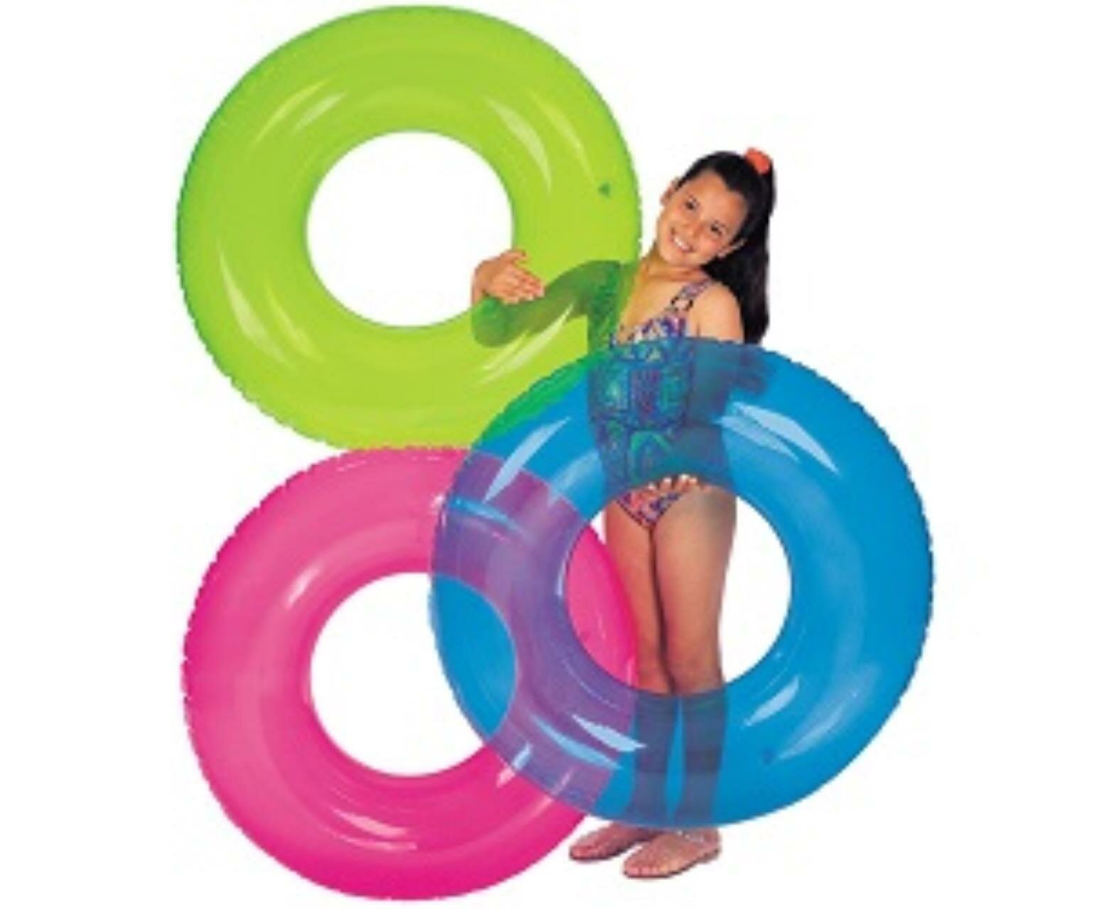 Надувной круг для плавания INTEX Color 76 см, для детей c 8 лет на пляж и в бассейн, нагрузка до 60 кг, плотный прозрачный неон, без насоса, цвет микс / 1 шт интересное: