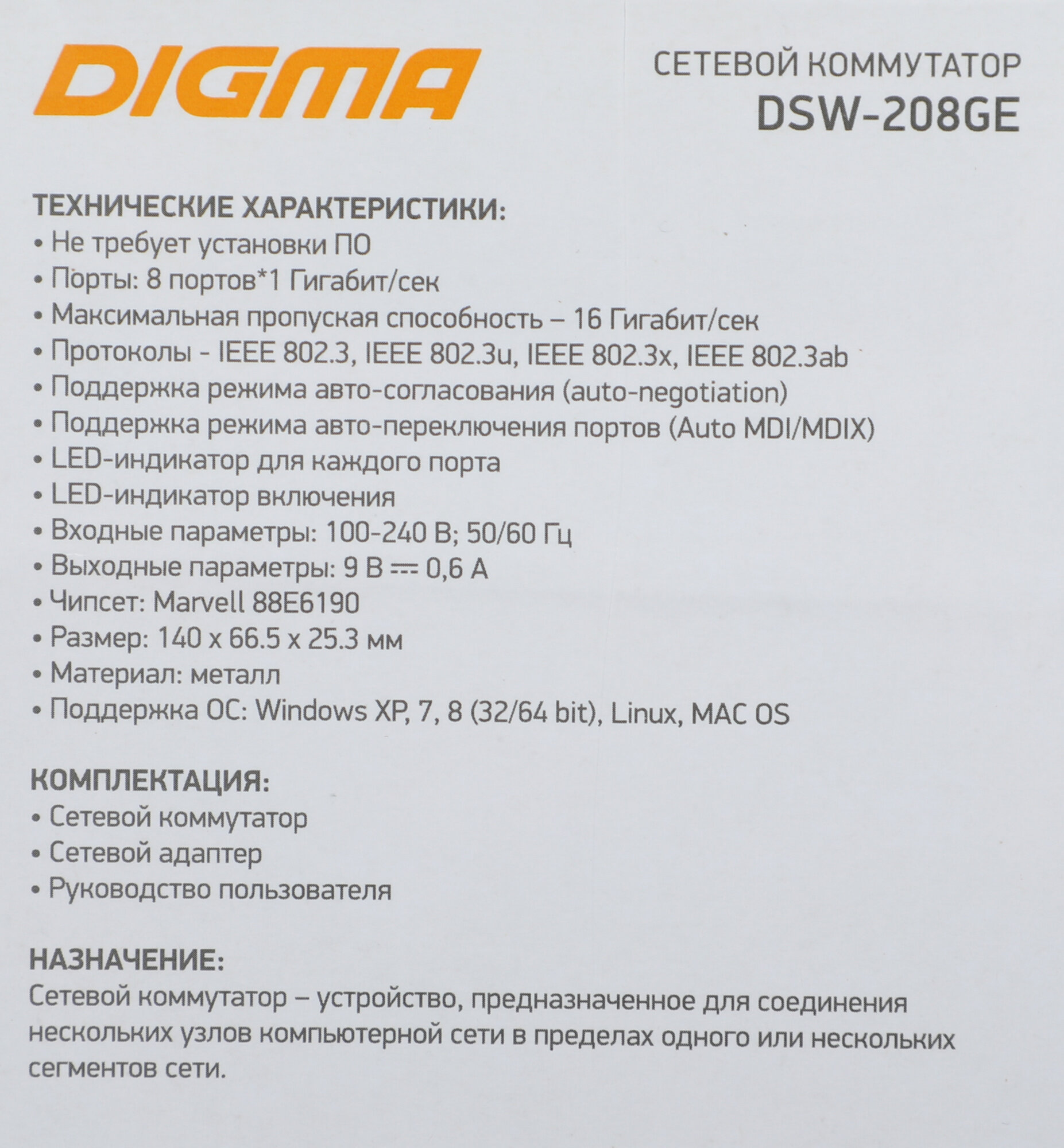 Коммутатор Digma Dsw-208ge 8G неуправляемый . интересное:
