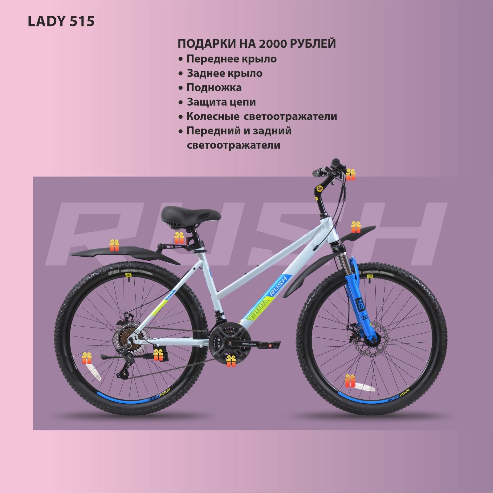 Велосипед горный женский дисковый 26" RUSH HOUR LADY 515 21 скорость белый рама 15" рост 145-165 см. MTB/раш/велосипед женский/для девушки/для девочки/взрослый/hardtail/с амортизацией/SHIMANO