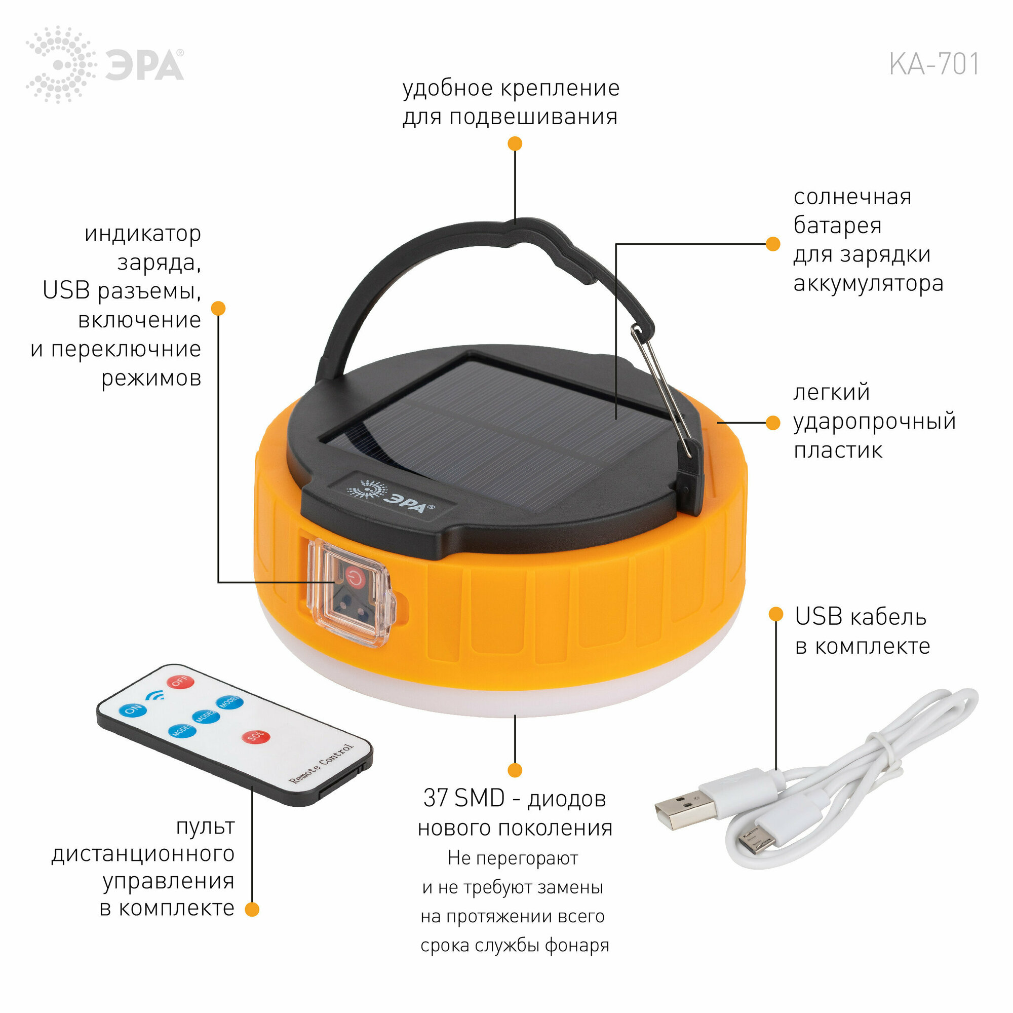 Фонарь светодиодный кемпинговый ЭРА KA-701 Персей аккумуляторный на солнечной батарее, powerbank, USB, подвесной светильник с пультом управления, 3 режима