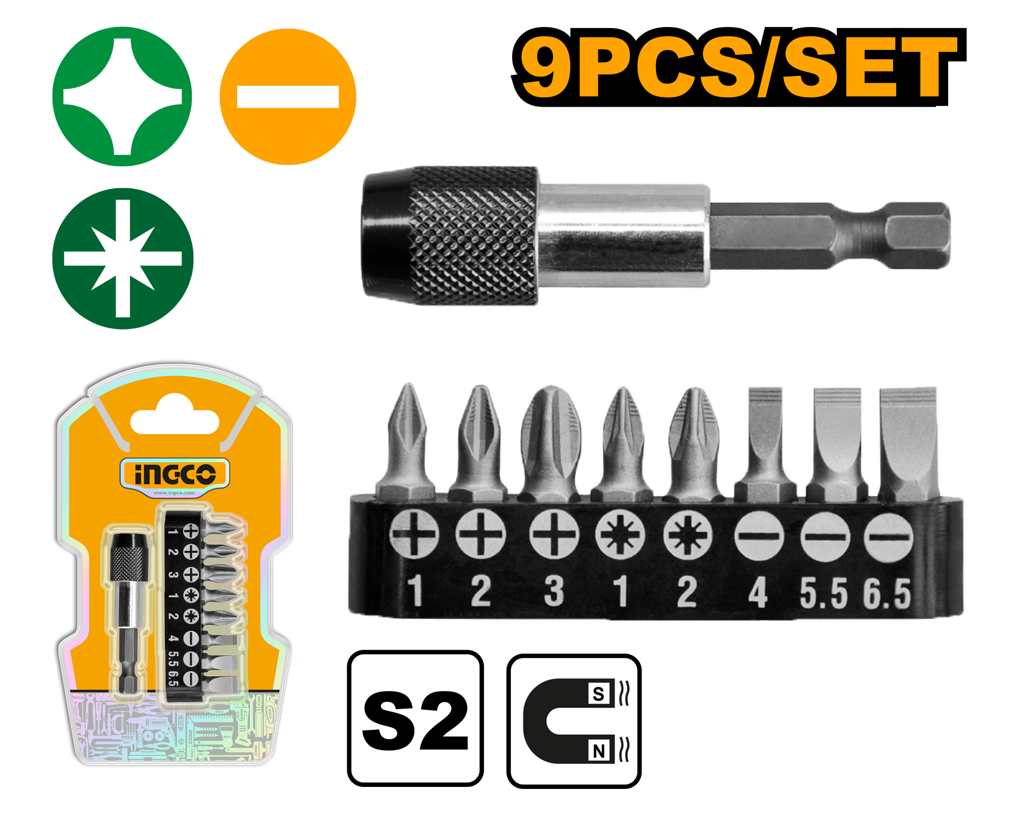 Набор бит с магнитным держателем (9 предметов; 25 мм) INGCO AKSD0071