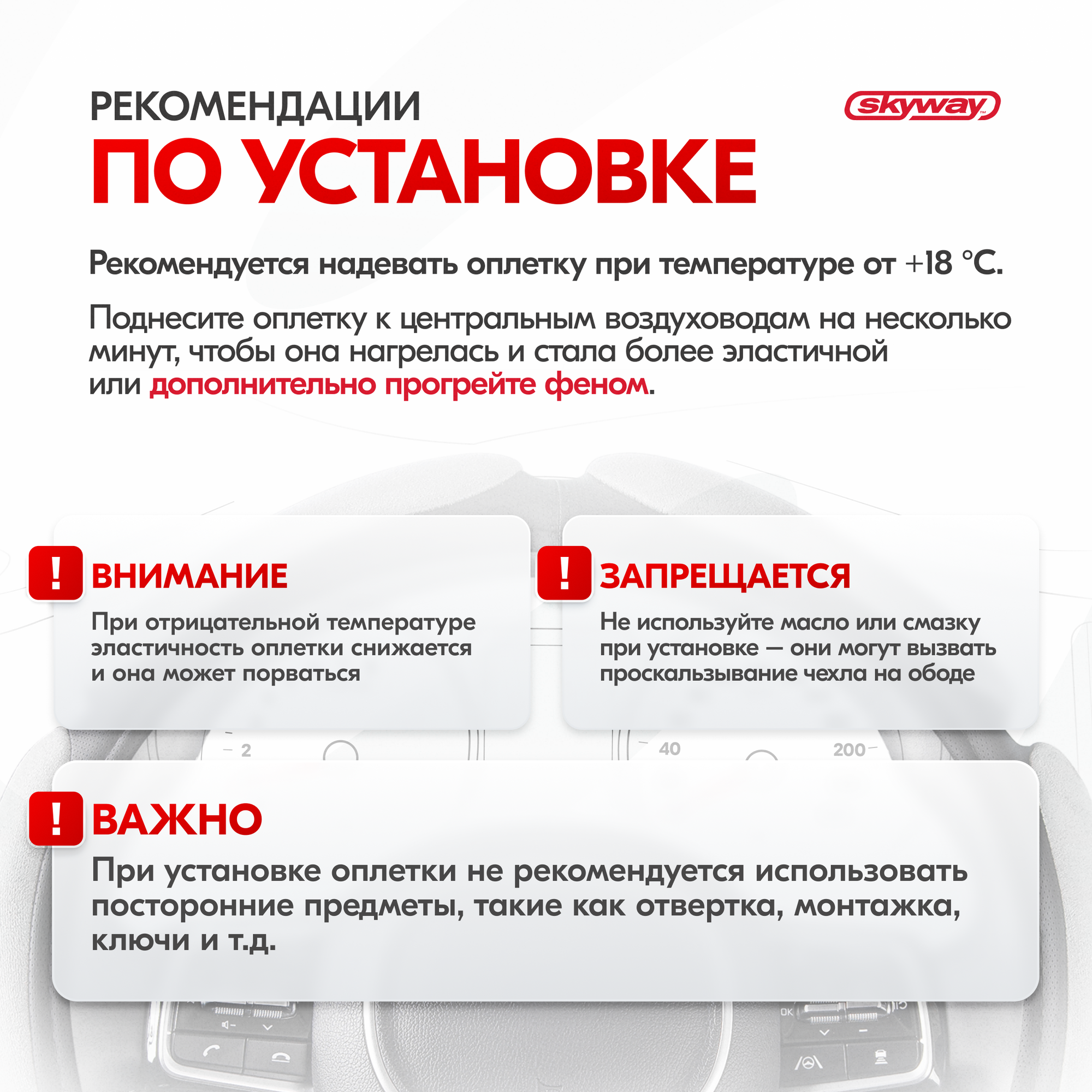 | Дополнительная информация | Рекомендации производителей: выбирайте оплётку под размер вашего рулевого колеса. Неверно выбранный размер может стать причиной проскальзывания оплётки, привести к невозможности снять или надеть её на руль. |