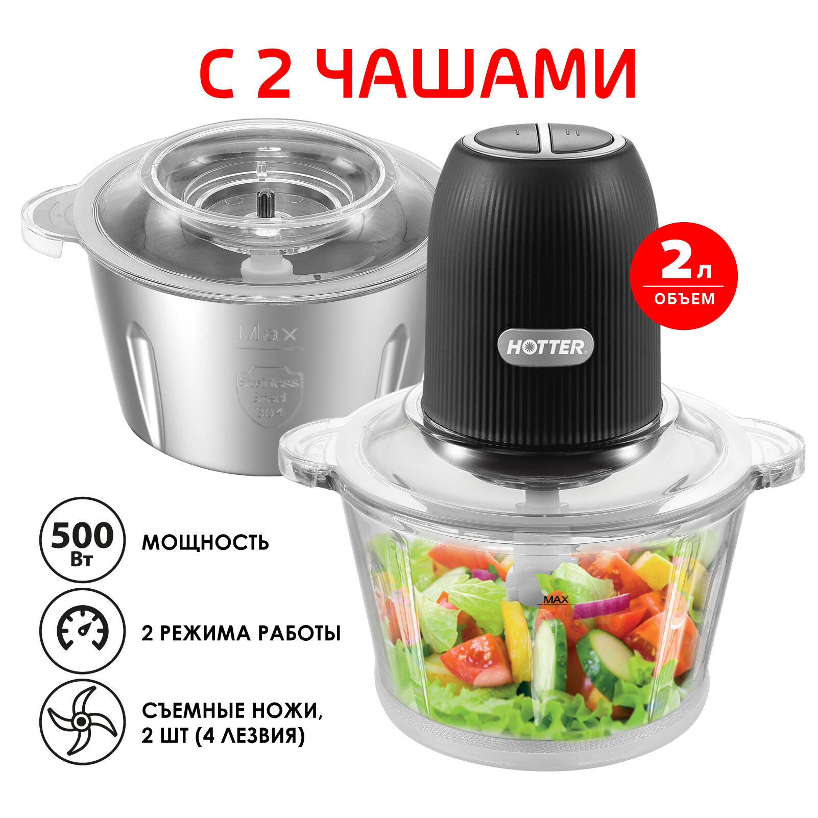 Измельчитель с двумя чашами по 2 литра Hotter HX-22В , 500 W, черный интересное: