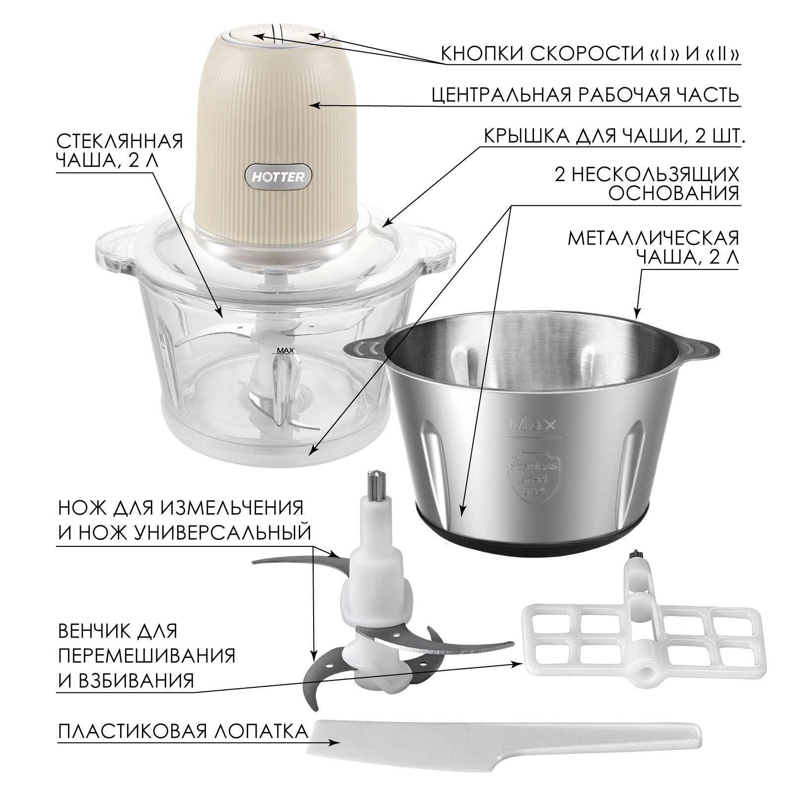 Измельчитель с двумя чашами по 2 литра Hotter HX-22 , 500 W, бежевый интересное: