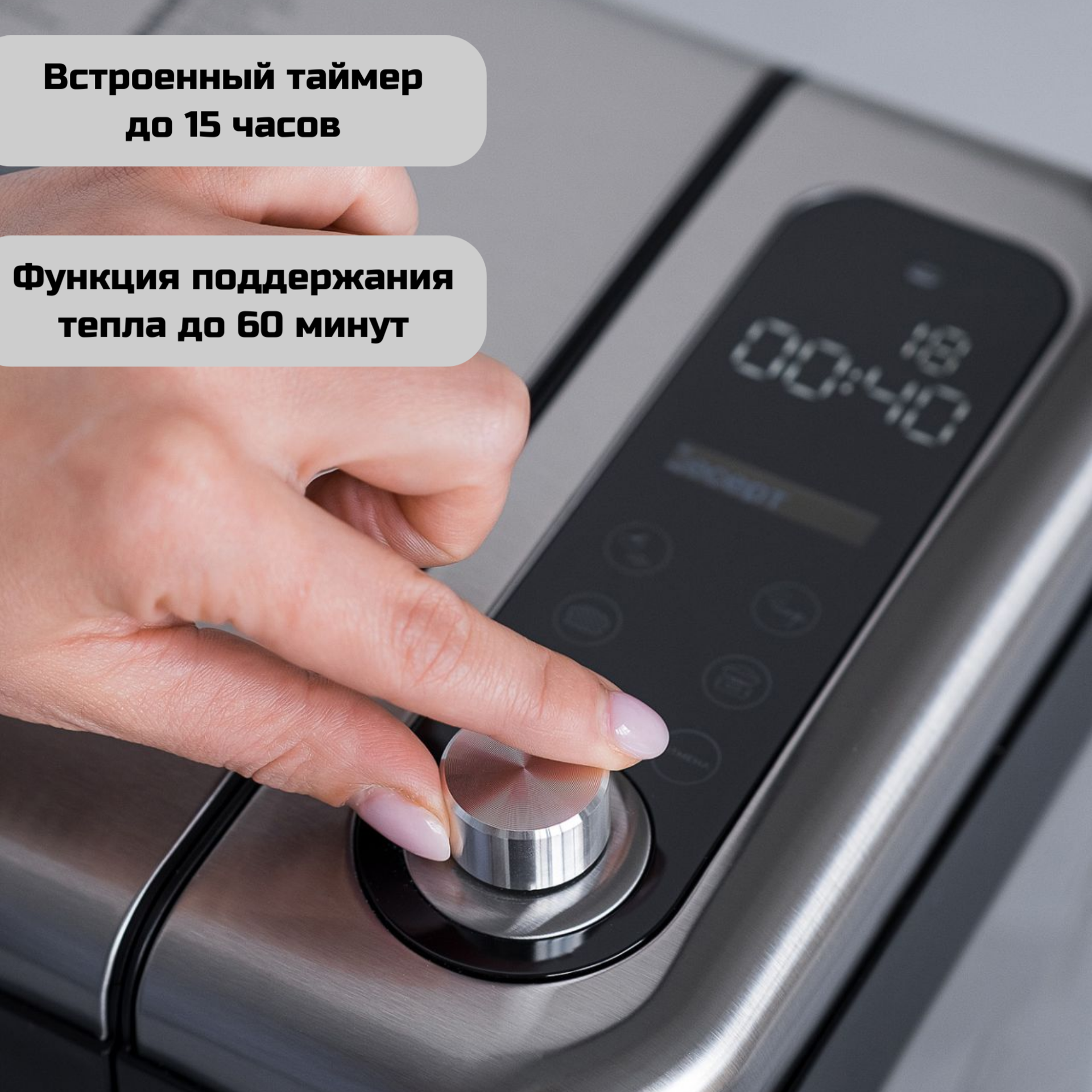 Мне нравится качество материалов. После многих готовок форма и корпус не потемнели. Внутренние детали вынимаются, чтобы помыть. Сама форма с антипригарным покрытием из керамики. Могу заранее настроить старт готовки. |