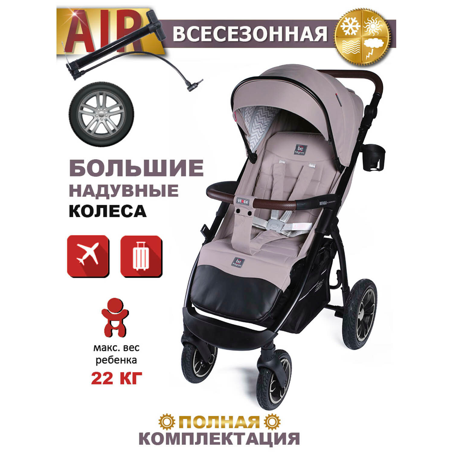 BabyCare Прогулочная Коляска Venga с надувными колесами, до 22кг, бежевый