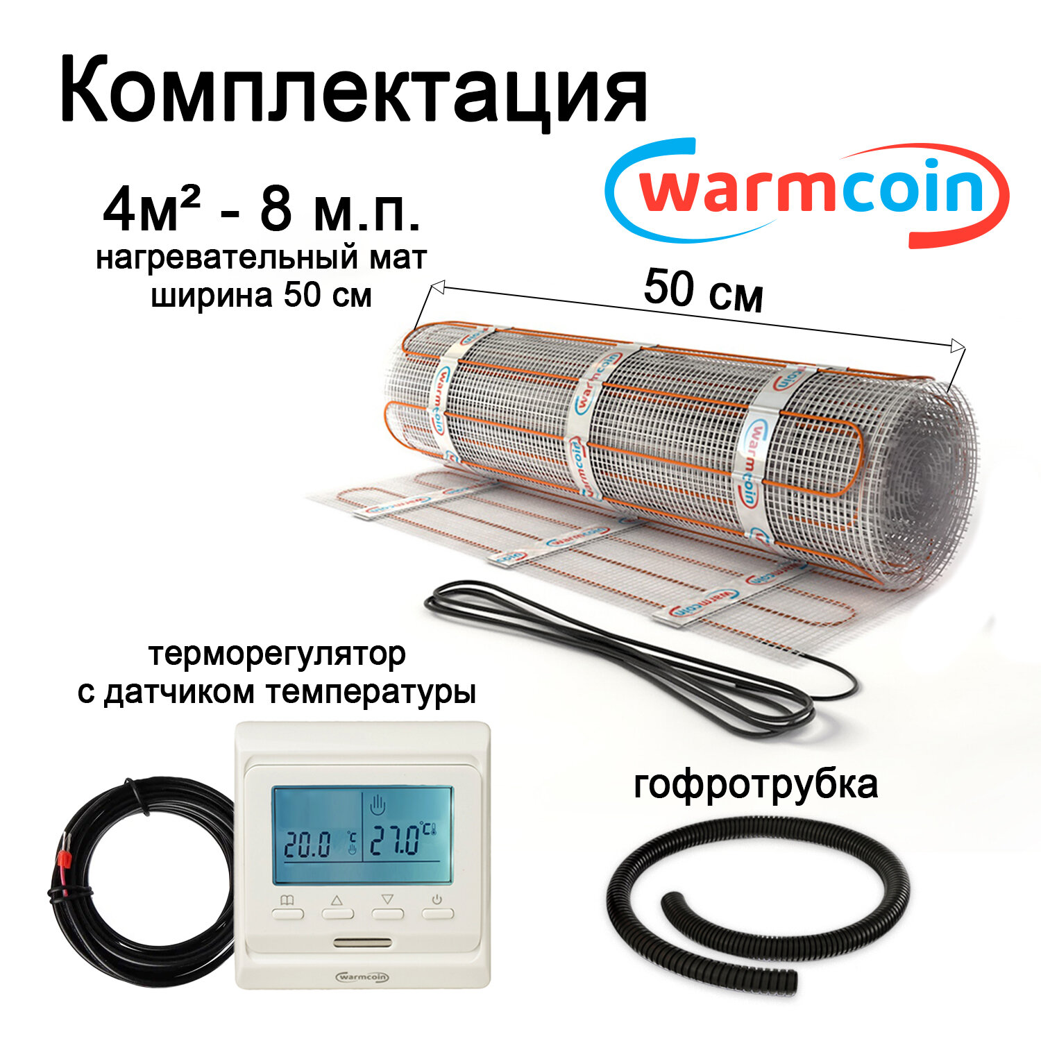 Теплый пол Warmcoin Экомат 4 м.кв. (0.5 х 8 м ) с термостатом