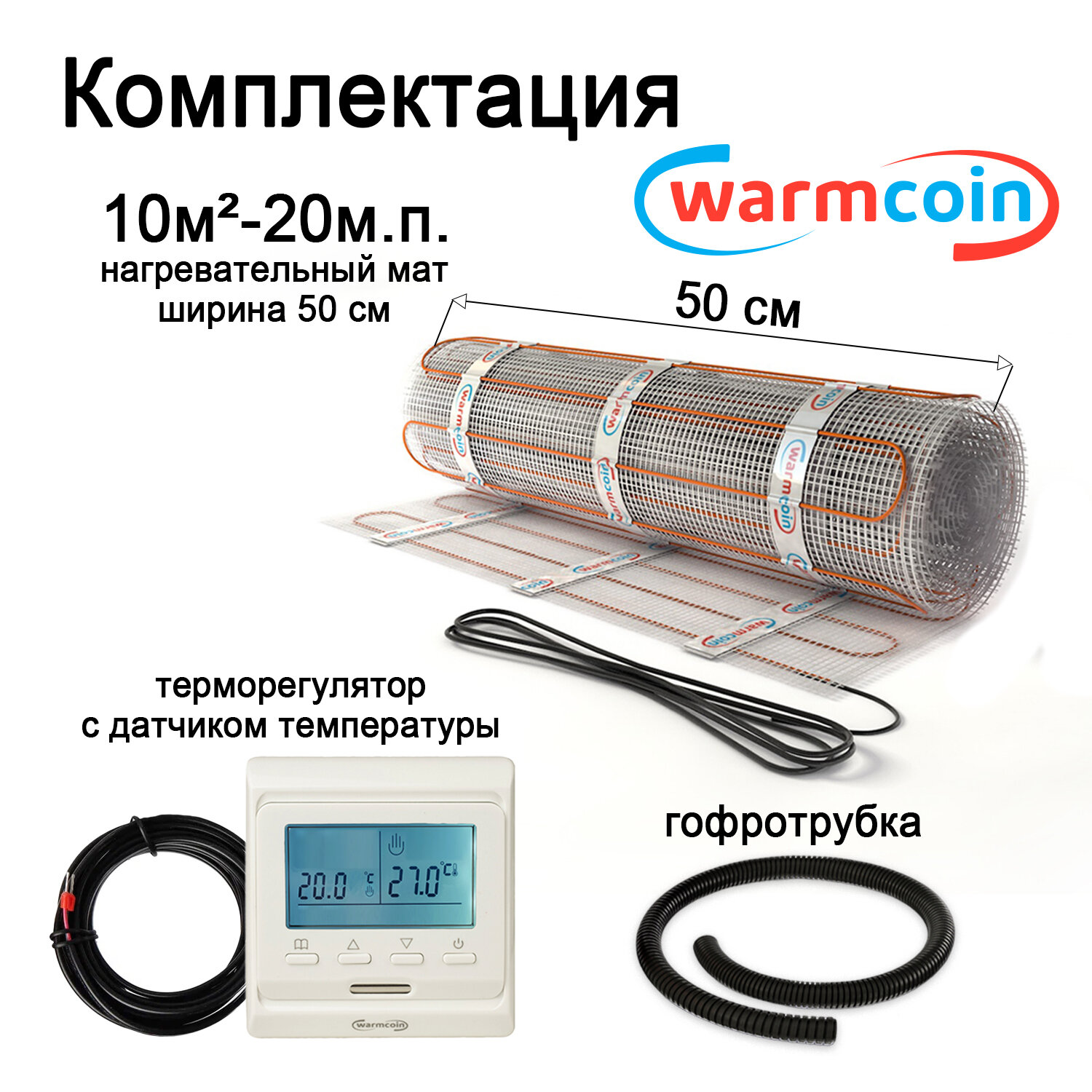 Теплый пол Warmcoin Экомат 10 м.кв. (0.5 х 20 м ) с термостатом