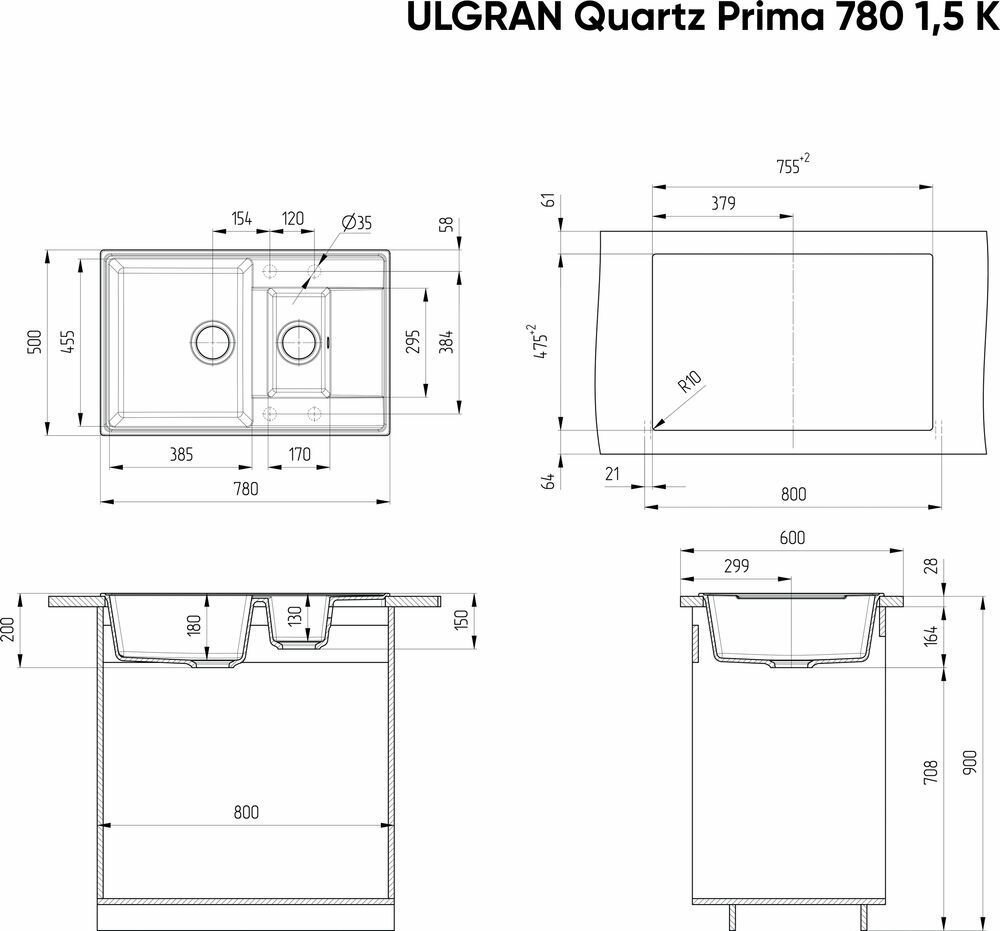 СохранитьМойка кухонная Ulgran из кварцевого композита прямоугольная Quartz Prima, цвет: уголь, база: 75.5х47.5 см, арт. Prima 780 1,5 K-07 интересное: