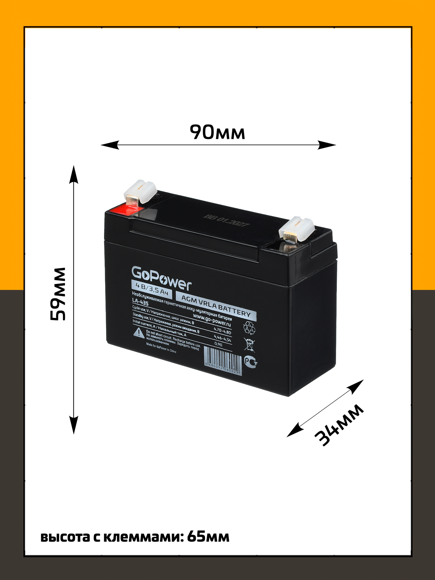 Кислотный аккумулятор GoPower LA-435 4v 3.5Ah (90x35x60mm) , 1шт.