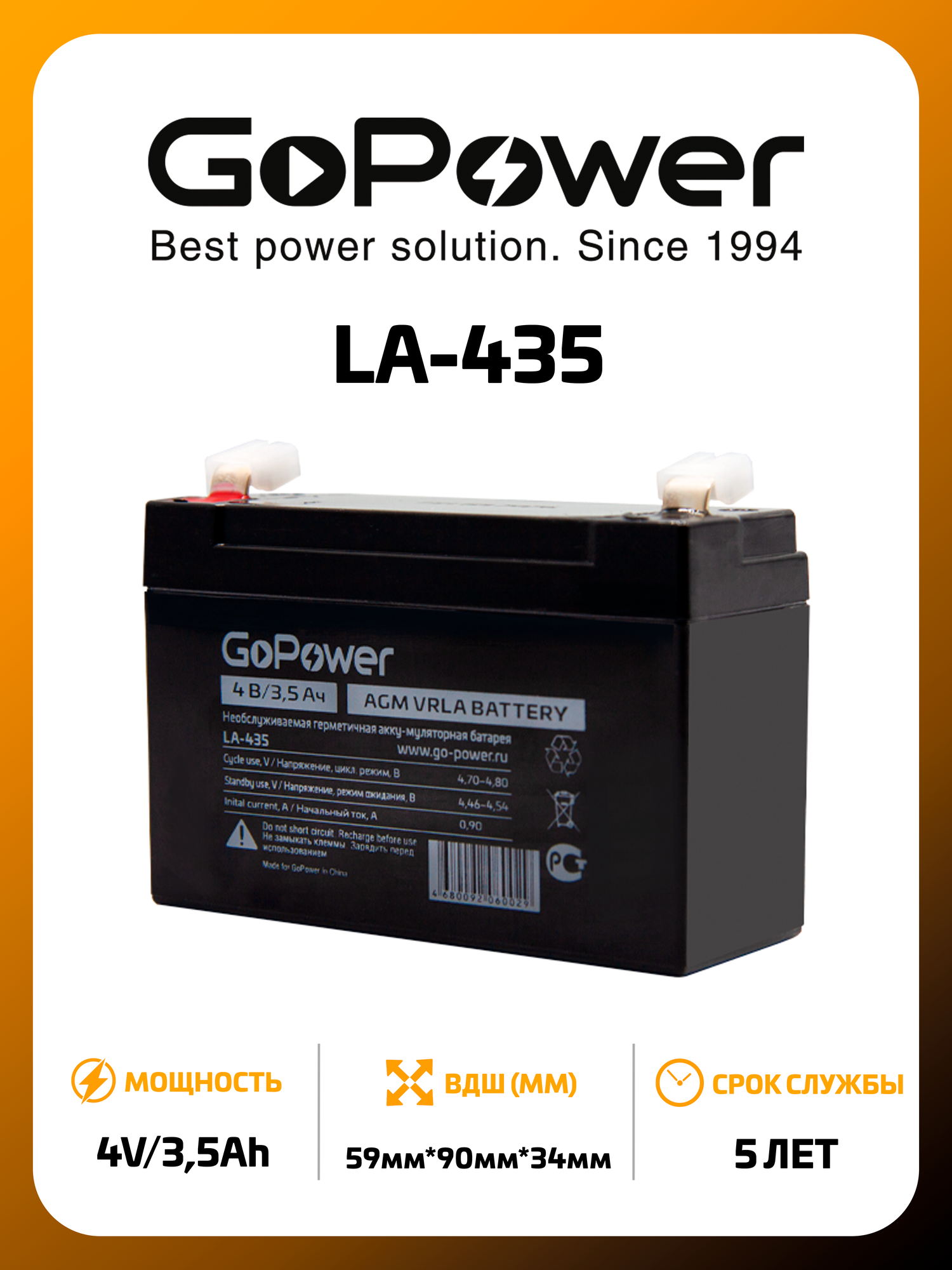 GoPower LA-435 (4V / 3.5Ah) Аккумулятор свинцово-кислотный GoPower LA-435 4V 3.5Ah (1/20) 00-00015320