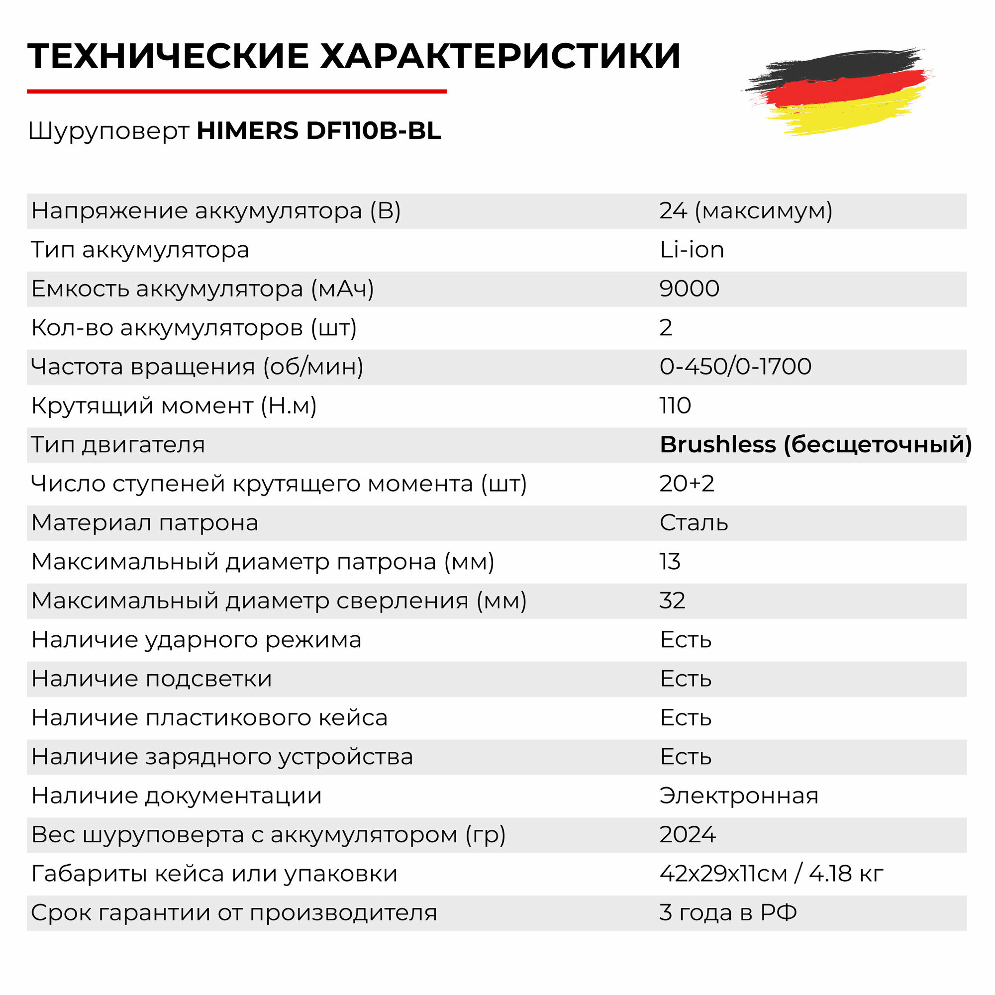 Ледоруб Бесщеточный шуруповерт HIMERS DF24BL MAX аккумуляторный 24V, 2 АКБ по 9 А.ч., 110 Н.м., Кейс / для сверления, закручивания 24в ледобур