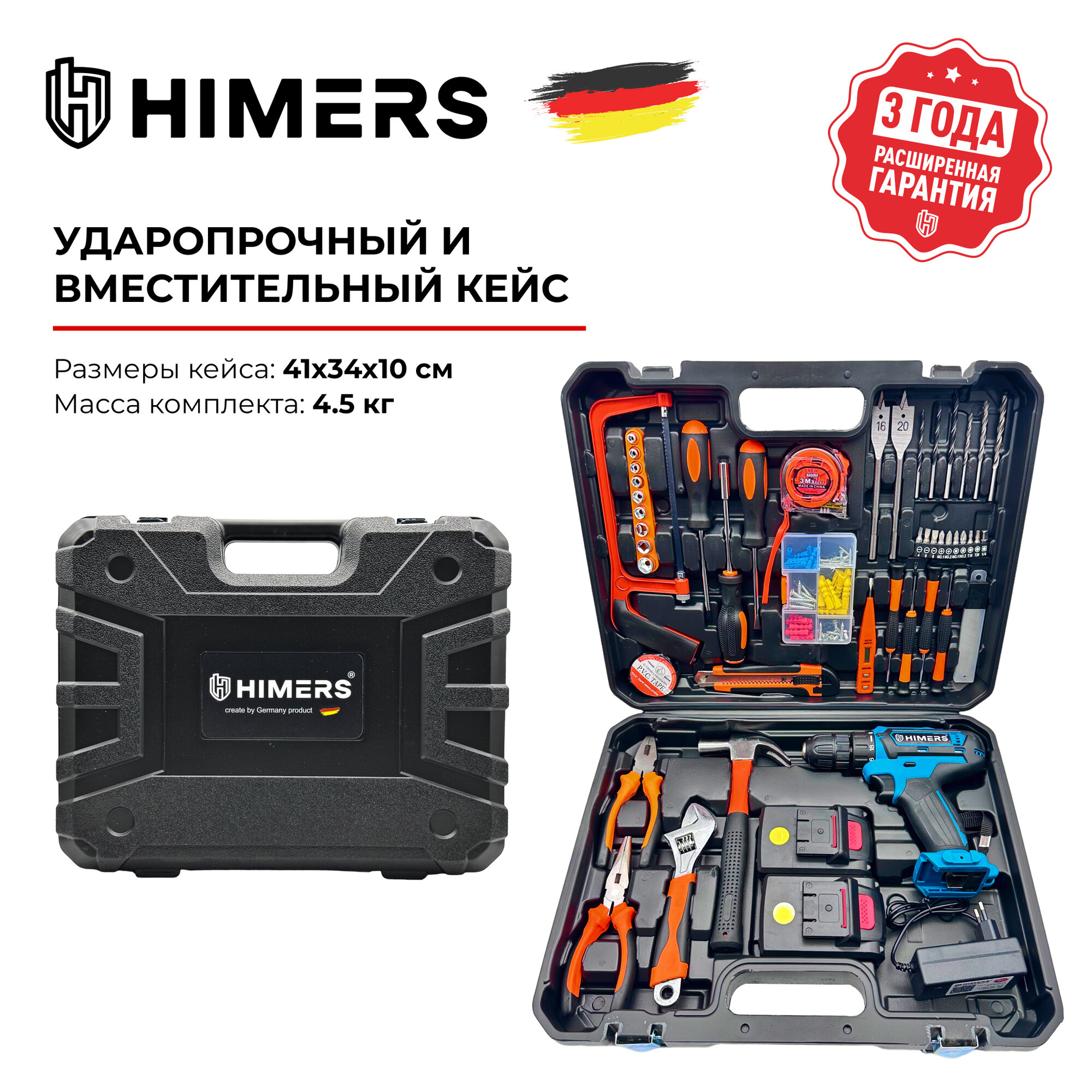 Дрель - шуруповерт HIMERS DF48B аккумуляторный 21V, 2 АКБ по 2 А. ч, 43 Н. м, 10мм патрон / Кейс с набором бит, свёрел, головок инструментов 107 предметов / многофункциональный для сверления, долбления, закручивания 21В