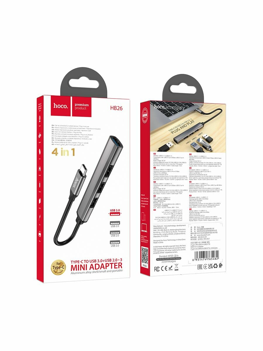 Переходник HOCO HB26 TYPE-C, USB 3.0/2.0 HUB на 4 порта, серый