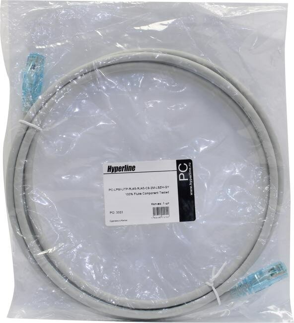 Патч-корд Hyperline сетевой кабель витой Ethernet Lan для интернета категория 6 U/UTP, 100% Fluke, LSZH, 2 м, серый