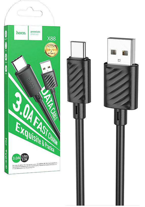 Кабель Hoco X88 для смартфона, USB - Type-C, 1 м, 3A, цвет черный, 1 шт