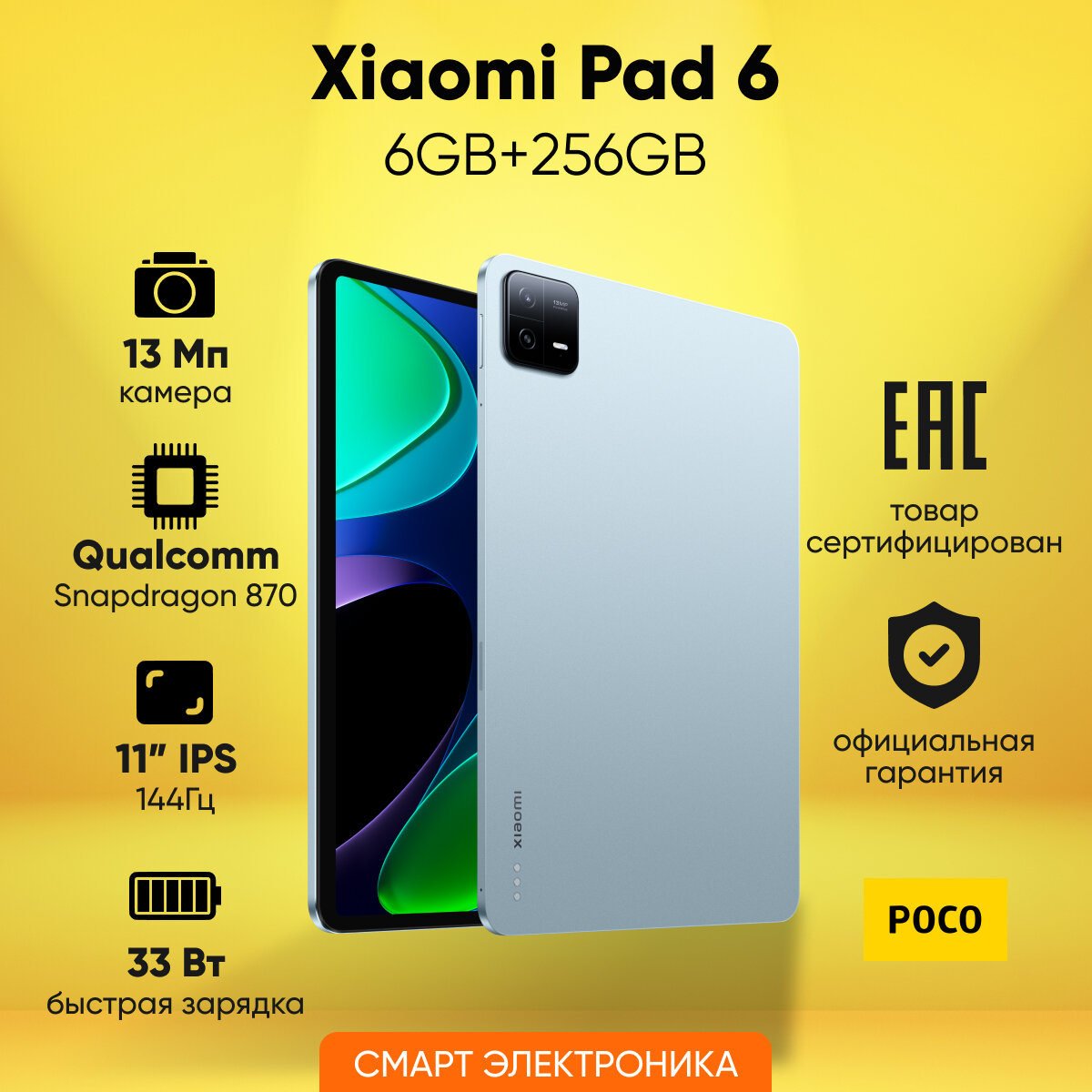 xiaomi pad 6 (23043rp34g) 11.0'' 2880 х 1800 пикселей ips/snapdragon 870 3.2ghz octa/8gb/256 gb/adreno 650/no3g/nogps/wifi/5.2/usb/8 mp+13 mp/490g/android 13/1y/gold