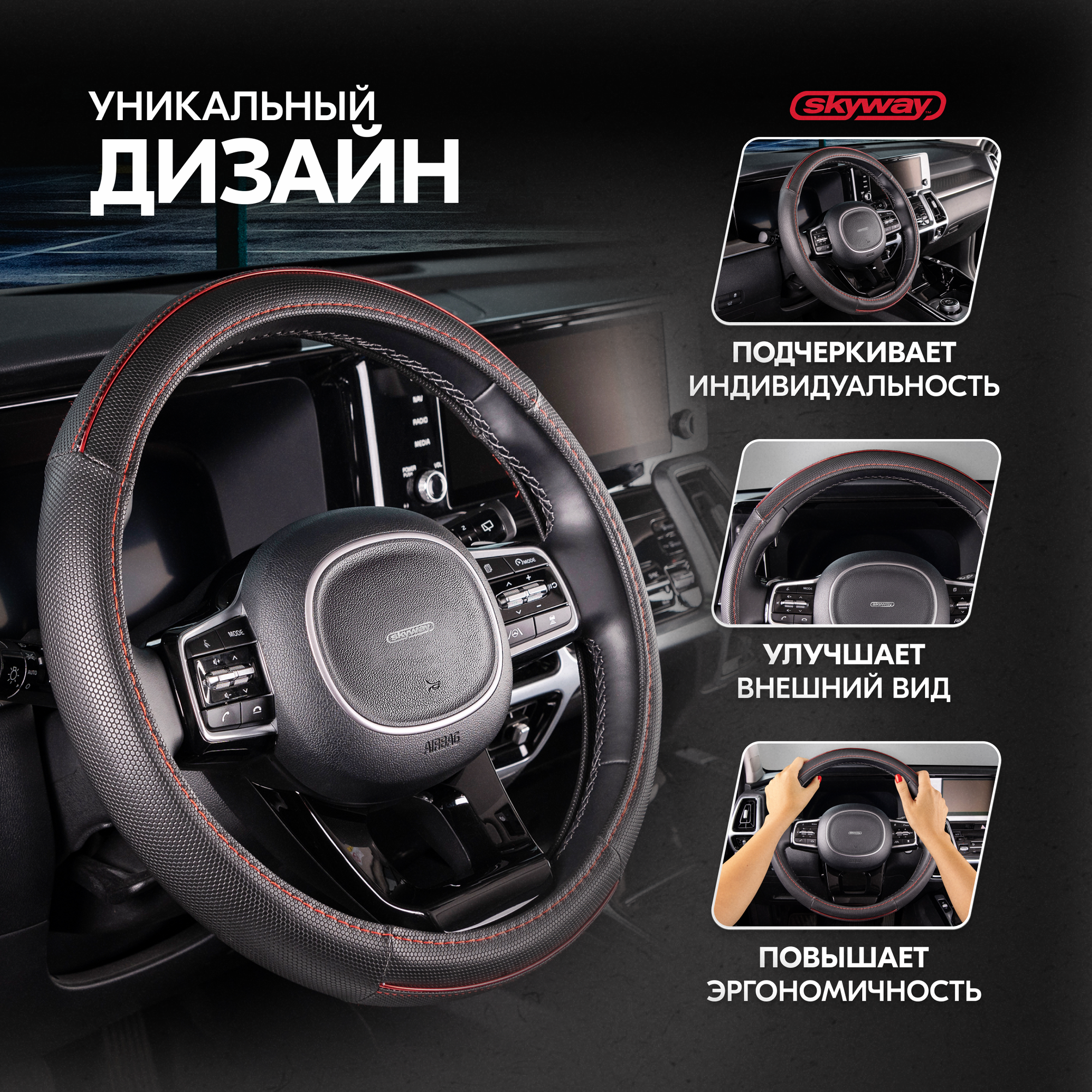 Оплетка руля SKYWAY Combo 3 M 37/38/39 см, экокожа, черно-красный, S01102359