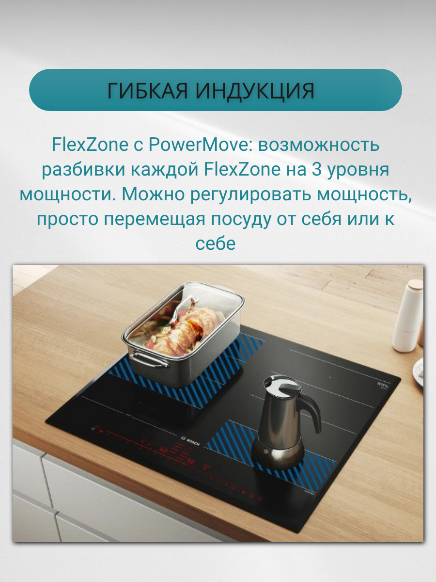| Дополнительная информация | FlexZone: объединение конфорок и свободное перемещение посуды |