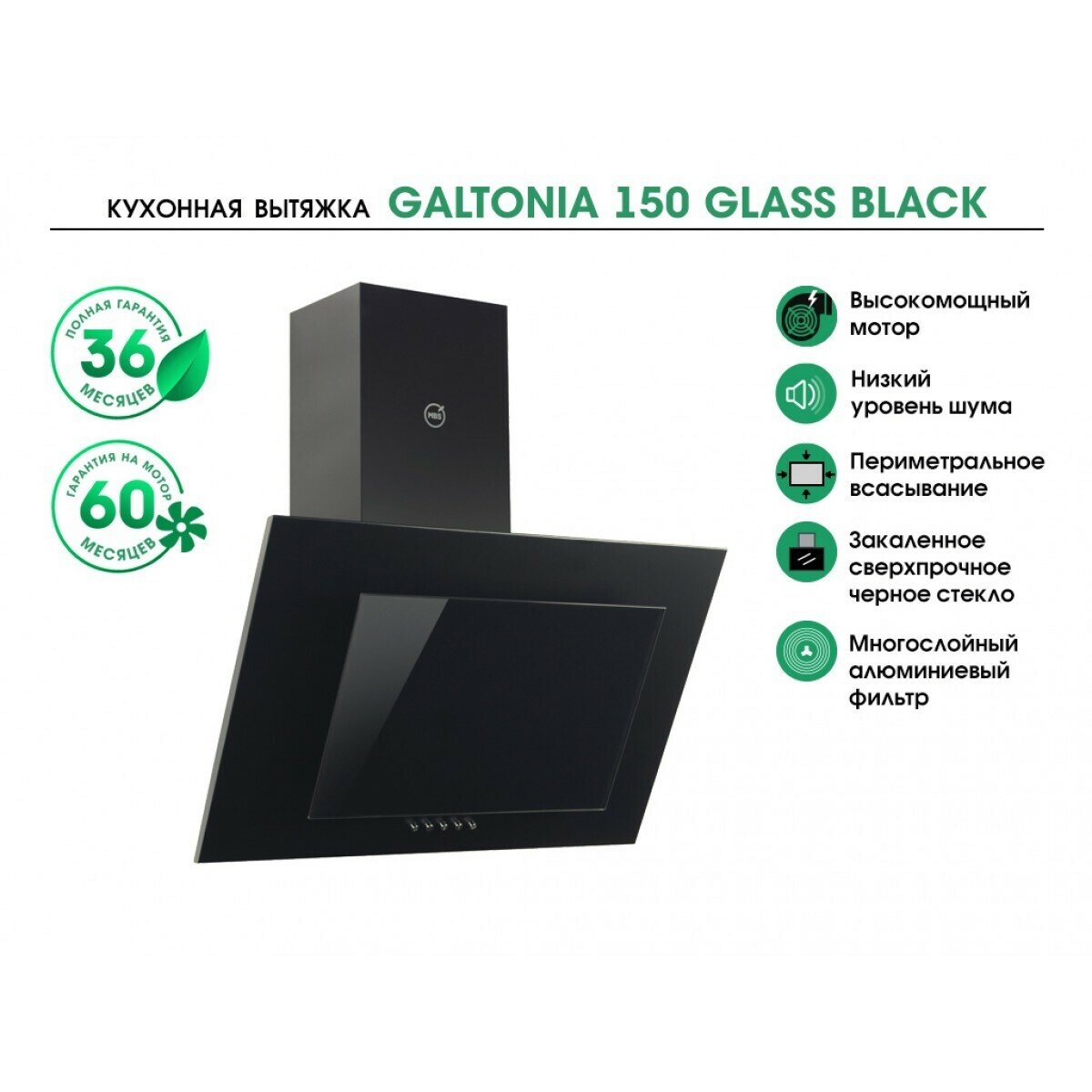 кухонная вытяжка наклонная MBS GALTONIA 150 GLASS BLACK/50 см/производительность 750м3/ч, низкий уровень шума.