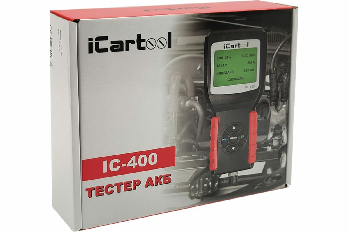 Тестер аккумуляторных батарей iCartool IC-400, АКБ 12/24В, до 2000А, тест системы пуска и зарядки, вольтметр, съемные кабеля