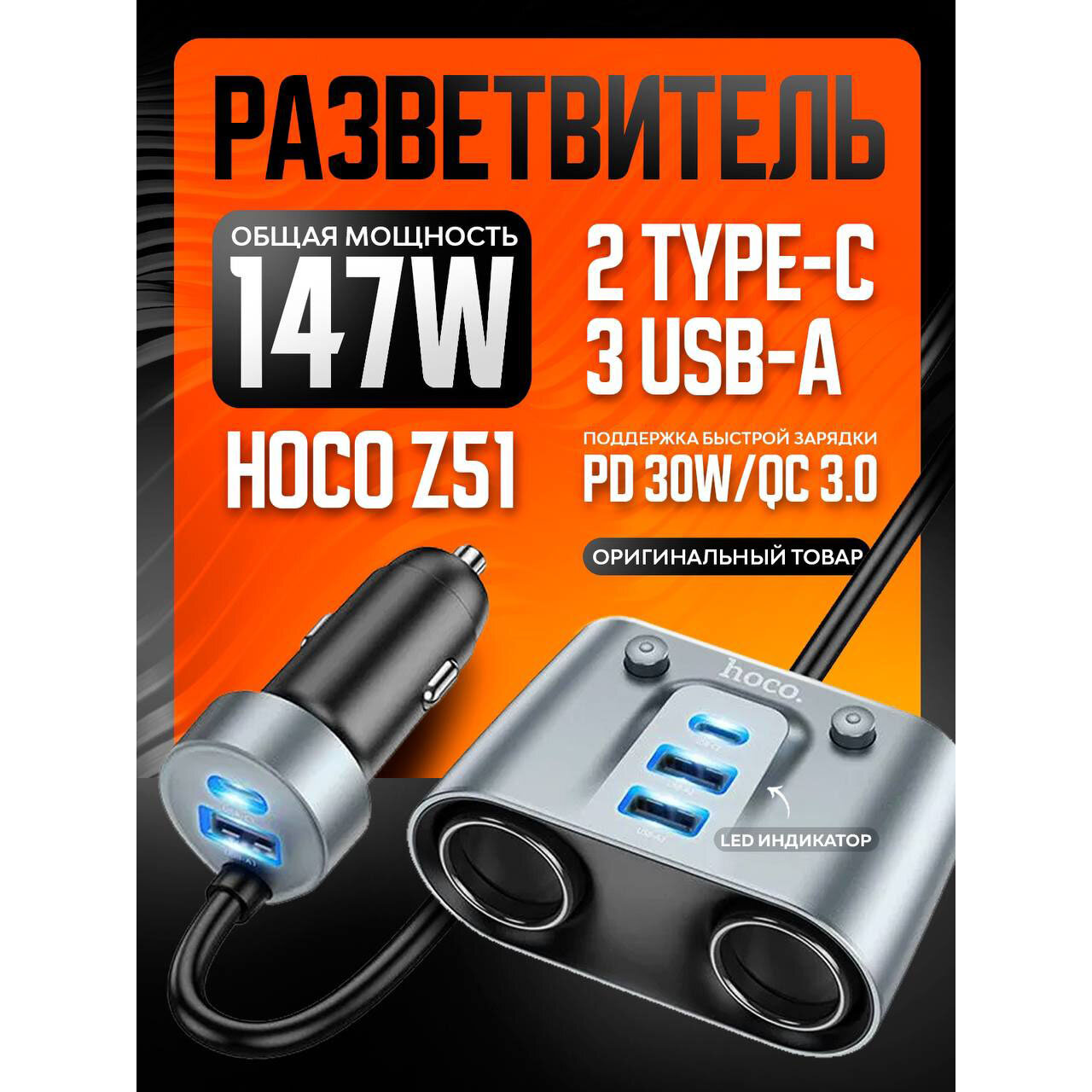 Разветвитель прикуривателя на 2 USB+1 PD+2 прикуривателя с проводом, Z51, HOCO, черный интересное: