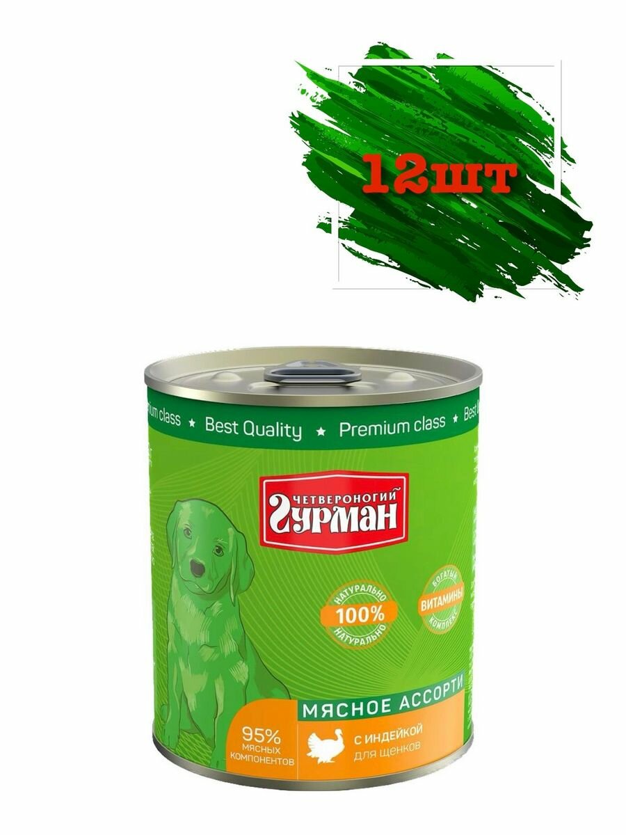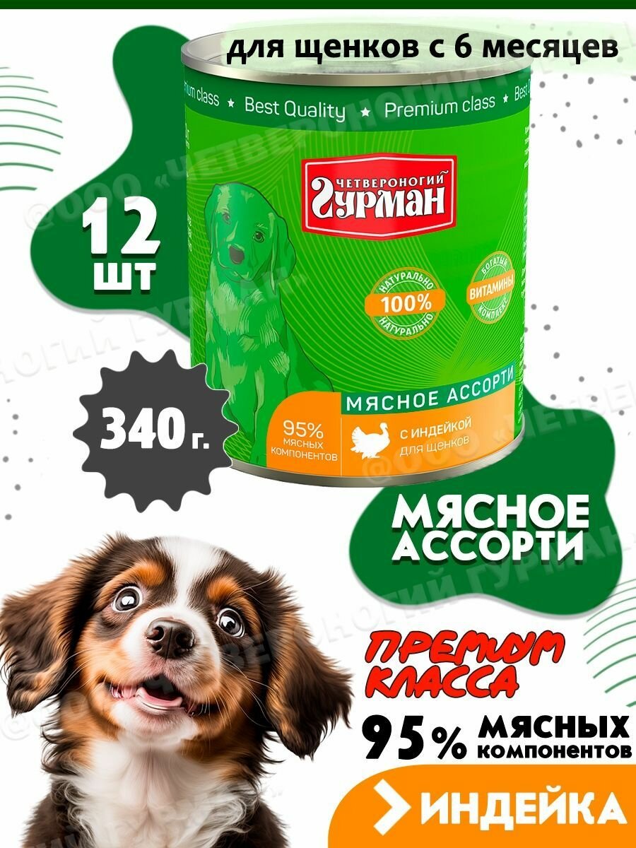 Корм консервированный для щенков Четвероногий Гурман "Мясное ассорти с индейкой", 340 г х 12 шт