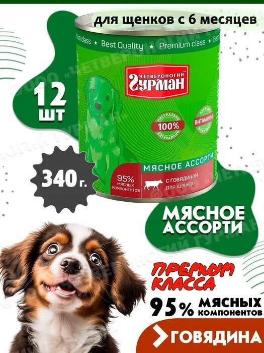 Купить Четвероногий Гурман консервы для щенков Мясное ассорти с Говядиной 340г (12 штук)