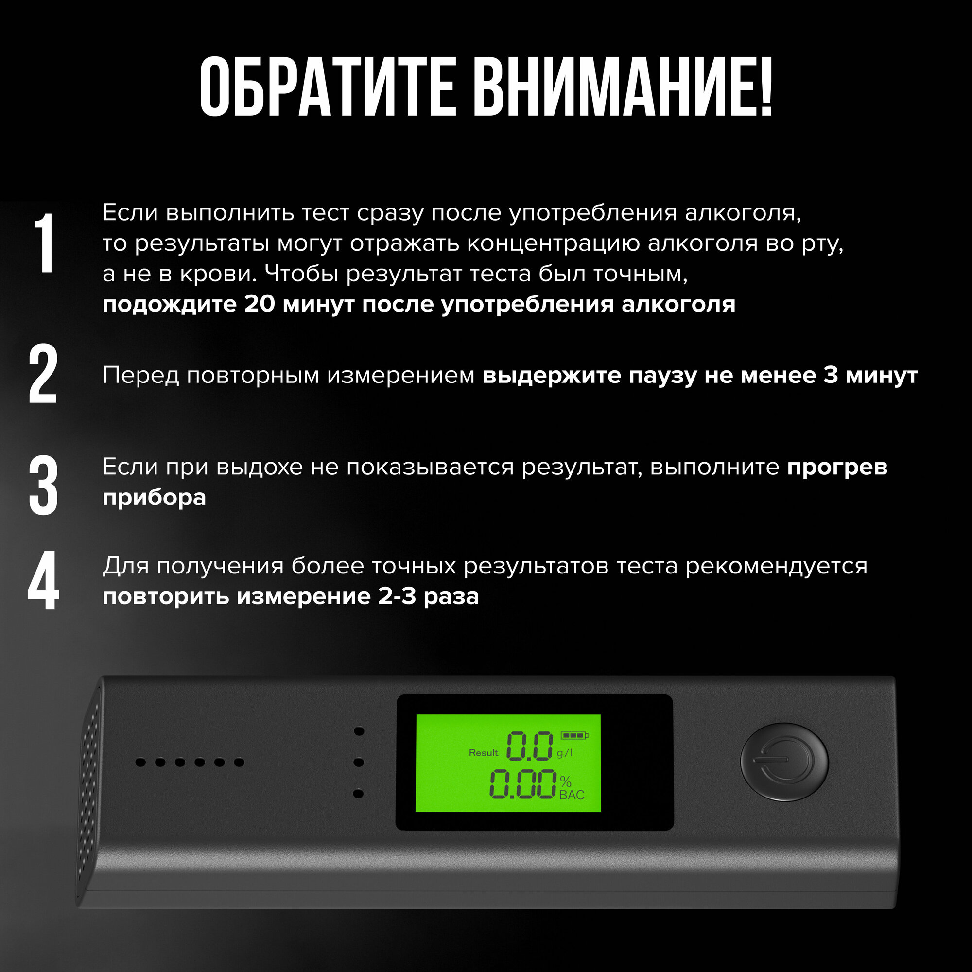 | Подробная комплектация | упаковка, алкотестер, кабель usb-c,инструкция |