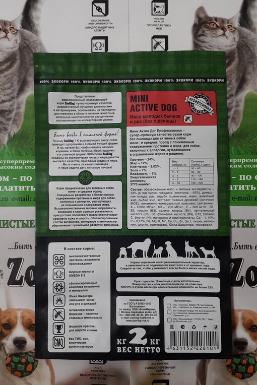 ZOORING MINI ACTIVE DOG гипоаллергенный для активных взрослых собак маленьких пород с мясом молодых бычков и рисом (2 кг)