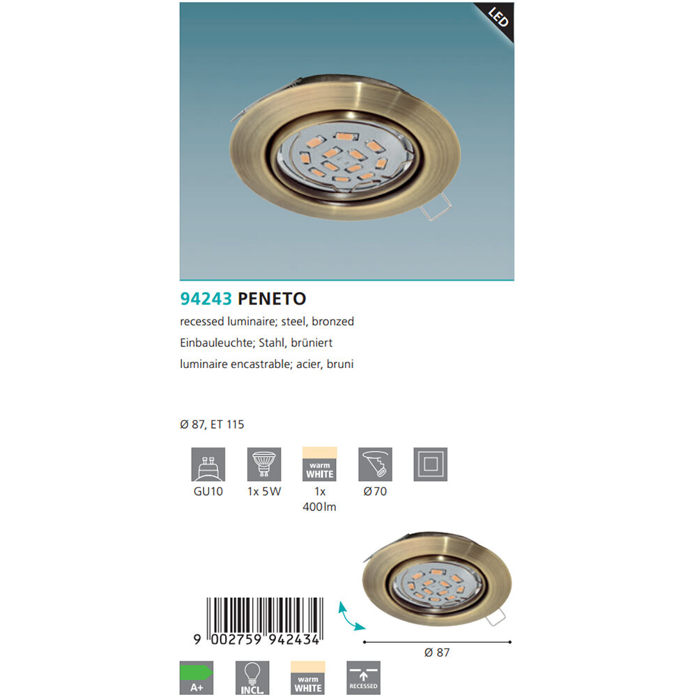 Ниже Вы можете прочитать отзывы на Встраиваемый светильник Peneto 94243, ознакомится с подробными характеристиками, посмотреть интересные обзоры и фотографии на Встраиваемый светильник Peneto 94243.
