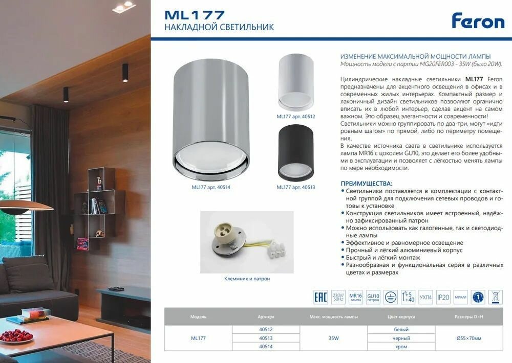 Светильник потолочный MR16 35W 230V, белый, ML177 с клеммой в комплекте, Feron, 40512