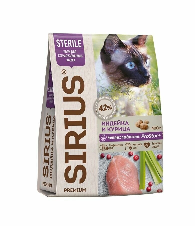 SIRIUS/Полнорационный сухой PREMIUM корм для стерилизованных кошек, Индейка и курица, 0.4 кг