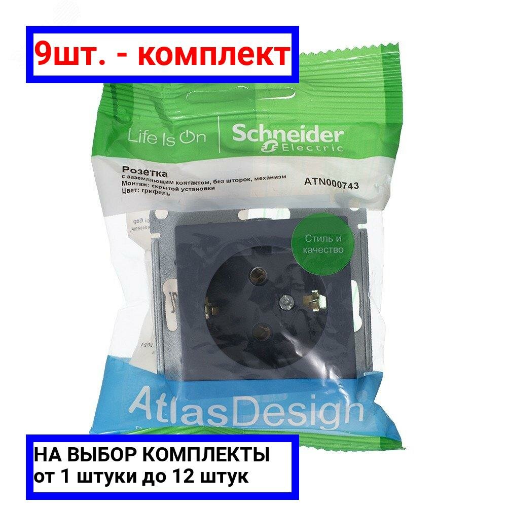 Купить Розетка с заземлением 9шт Systeme Electric AtlasDesign 16А скрытой установки 16А Грифель ATN000743