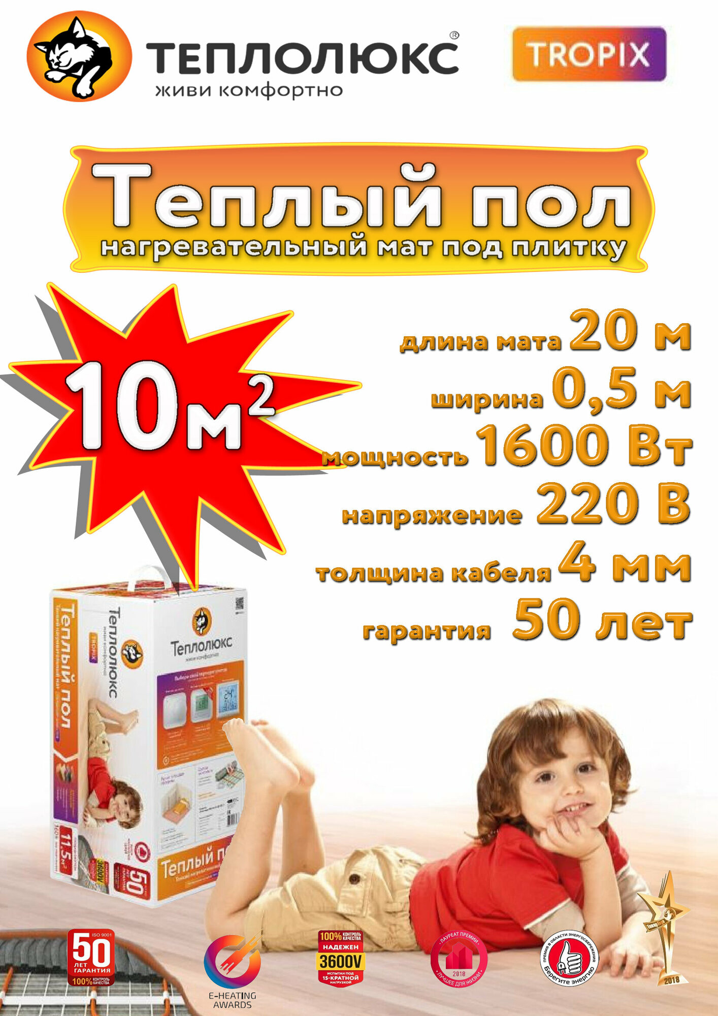 Теплый пол электрический под плитку, под ламинат Теплолюкс Tropix МНН 1600 Вт/10,0 кв. м.