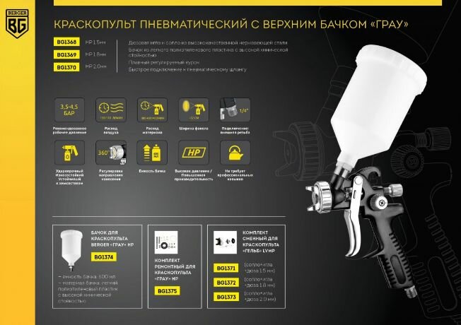 Краскораспылитель BERGER HP 1.8 мм «грау» Верхний бак BG1369