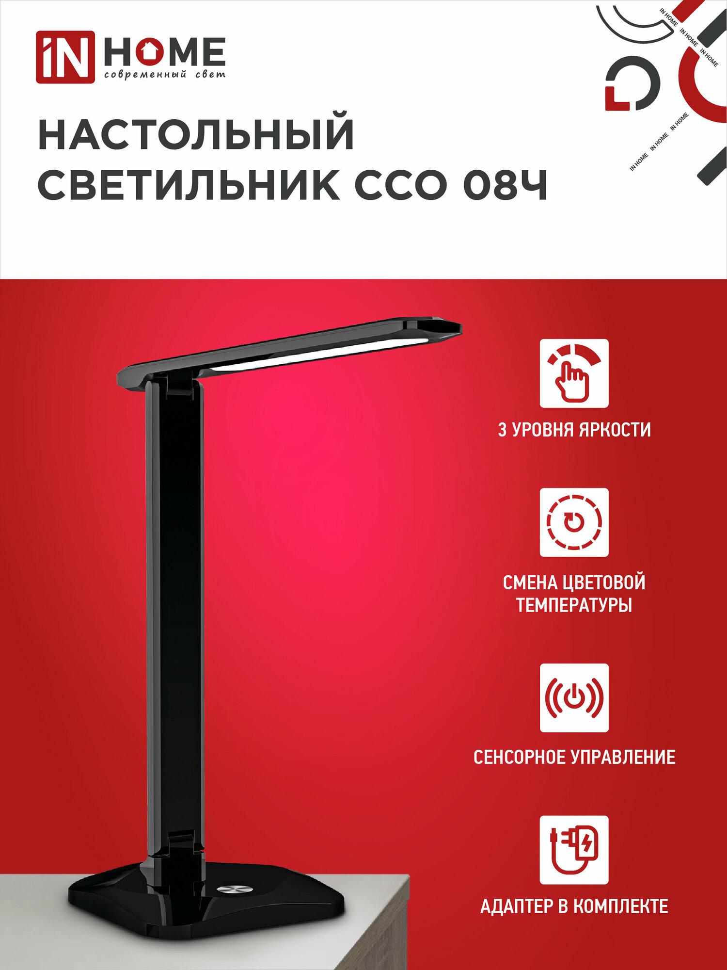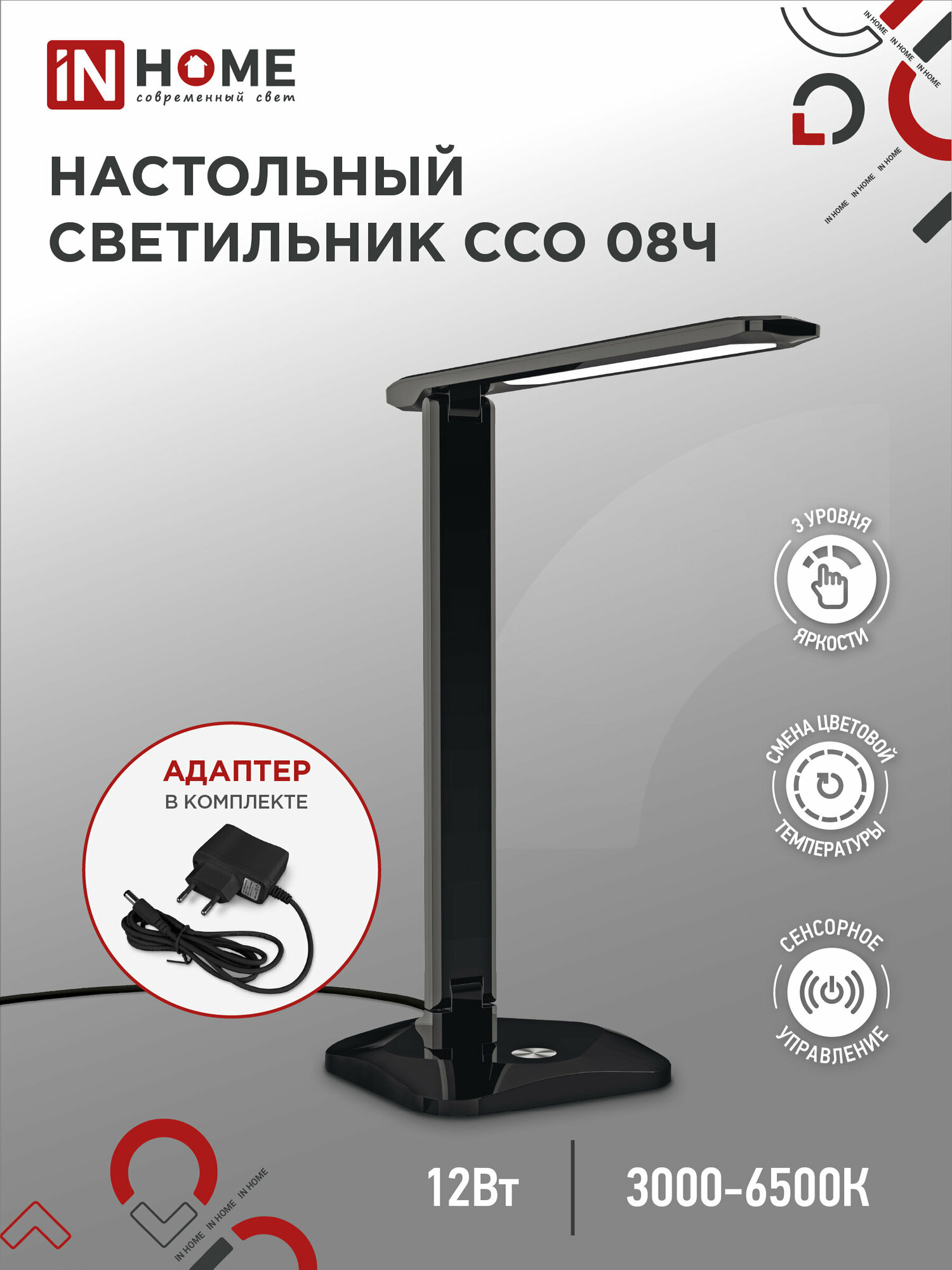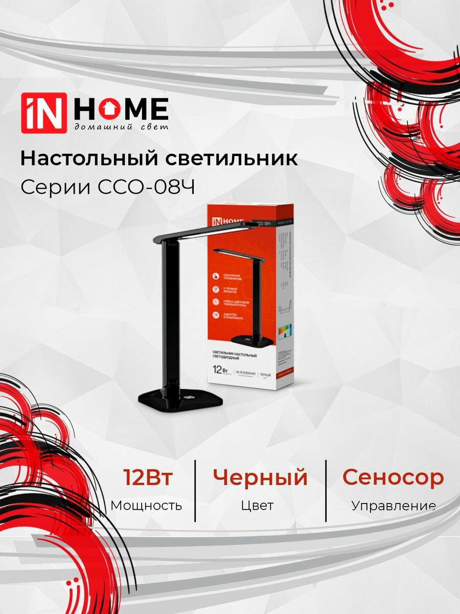 Светильник светодиодный настольный IN Home ССО 08Ч 12Вт 3000-6500К 600лм сенсор-диммер с адаптером черн. 4690612036564