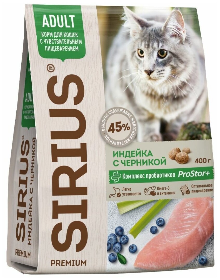 Сухой корм SIRIUS PREMIUM, Сириус для кошек с чувствительным пищеварением, индейка с черникой, 400 г х 3 шт.