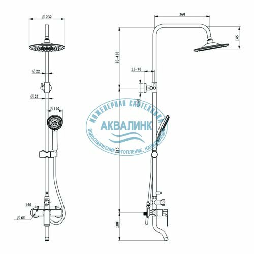 | Дополнительная информация | высота стойки для душа: 1245 мм; диаметр душевой лейки: 102 мм; диаметр верхнего душа: 232 мм |