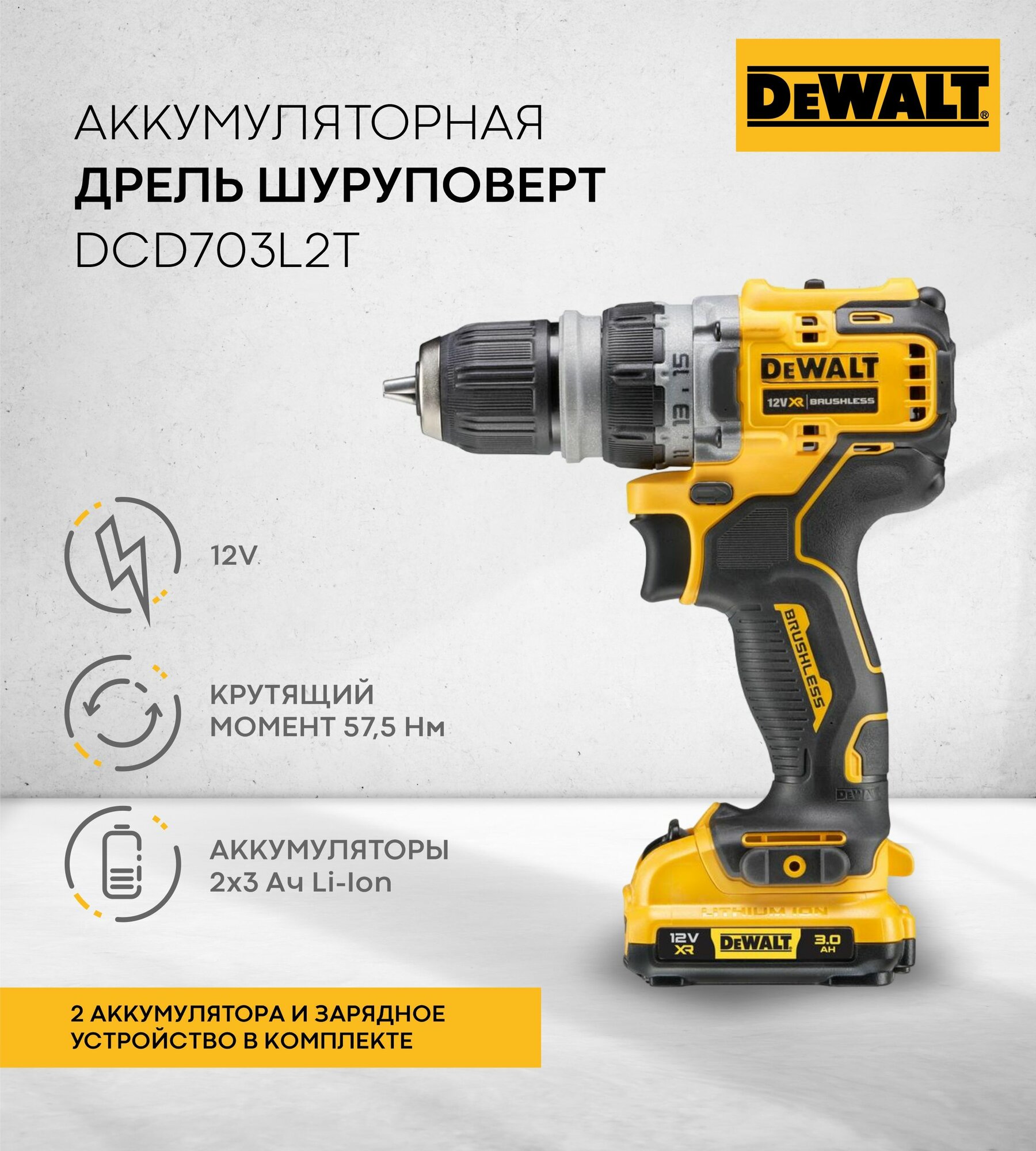Дрель-шуруповерт аккумуляторная DeWALT DCD 703 L2T бесщеточная DCD703L2T-QW