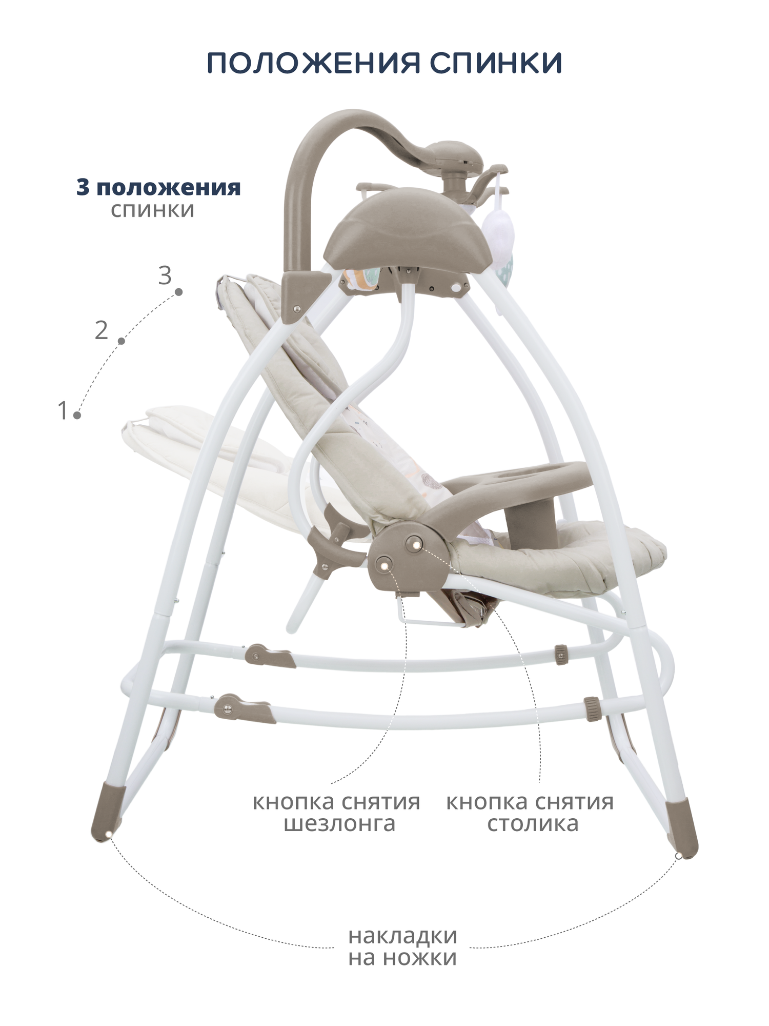 | Особенности | качели-трансформер / пульт ДУ / работа от батареек / регулировка громкости / таймер укачивания |