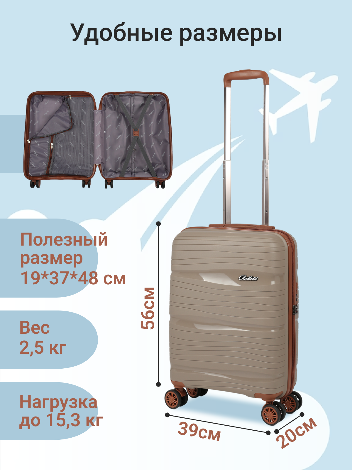 СохранитьЧемодан на колесах BELLETTI 3052-56см (бежевый/коричневый) S, ручная кладь интересное: