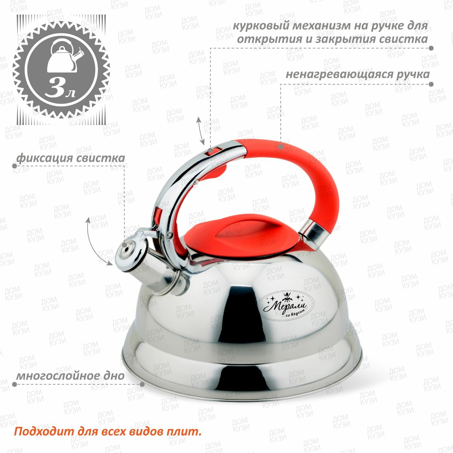 Купить Чайник со свистком Мерали 3 литра из нержавеющей стали для газовой электрической и индукционной плиты