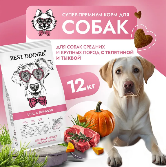 Сухой корм BEST DINNER 12кг для собак средних и крупных пород с Телятиной и Тыквой