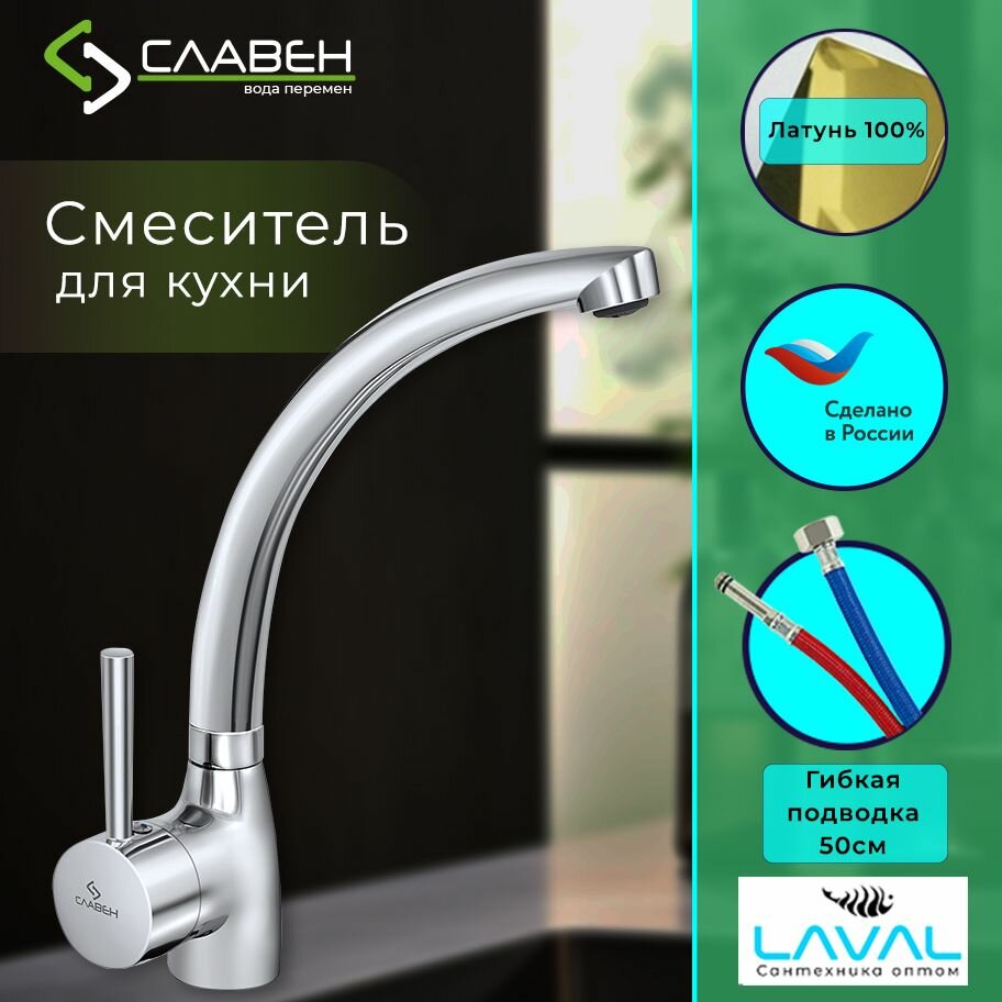 Смеситель для кухни с поворотным изливом,одноручный, хром, гибкая подводка 50см (Славен)