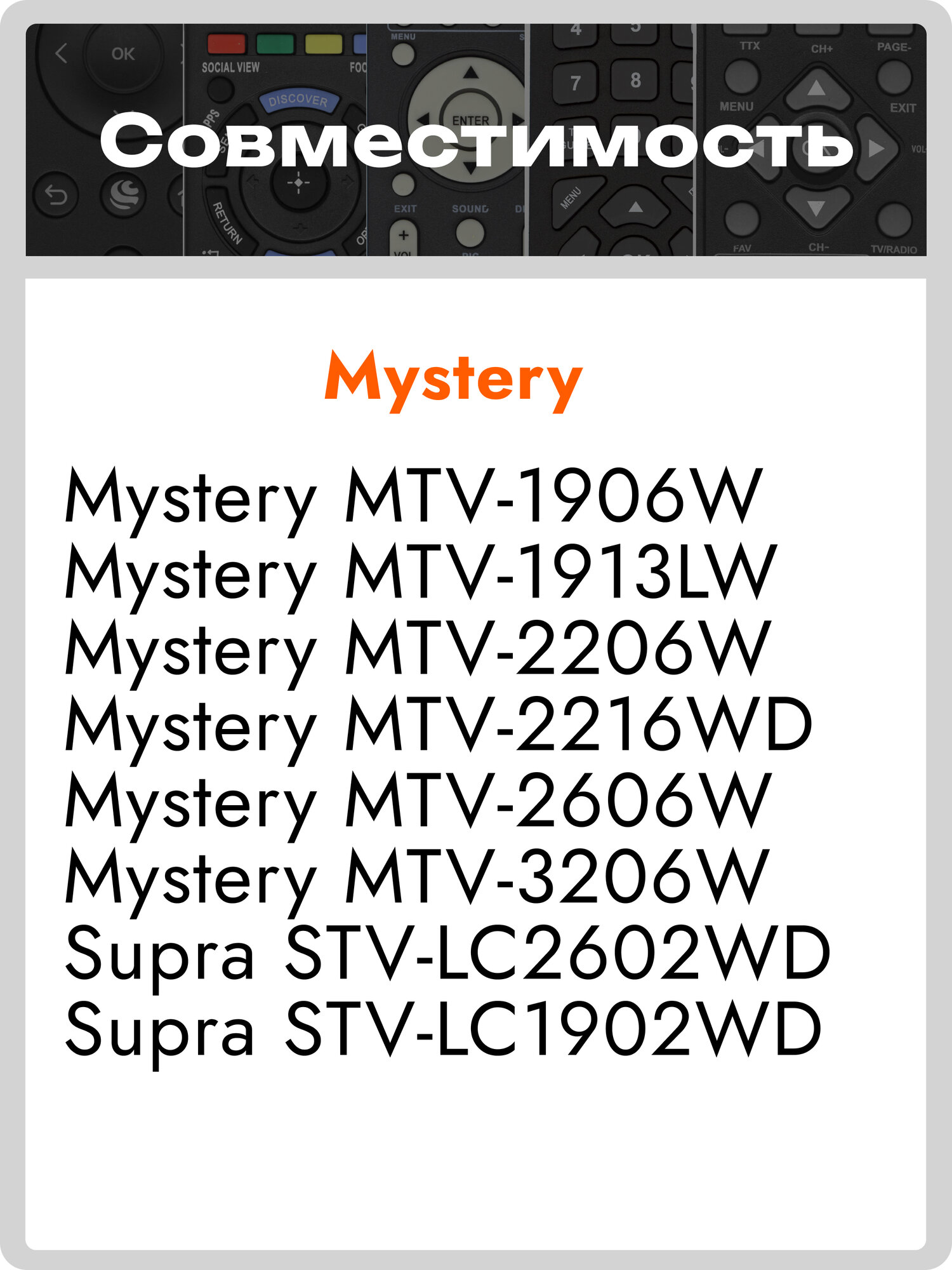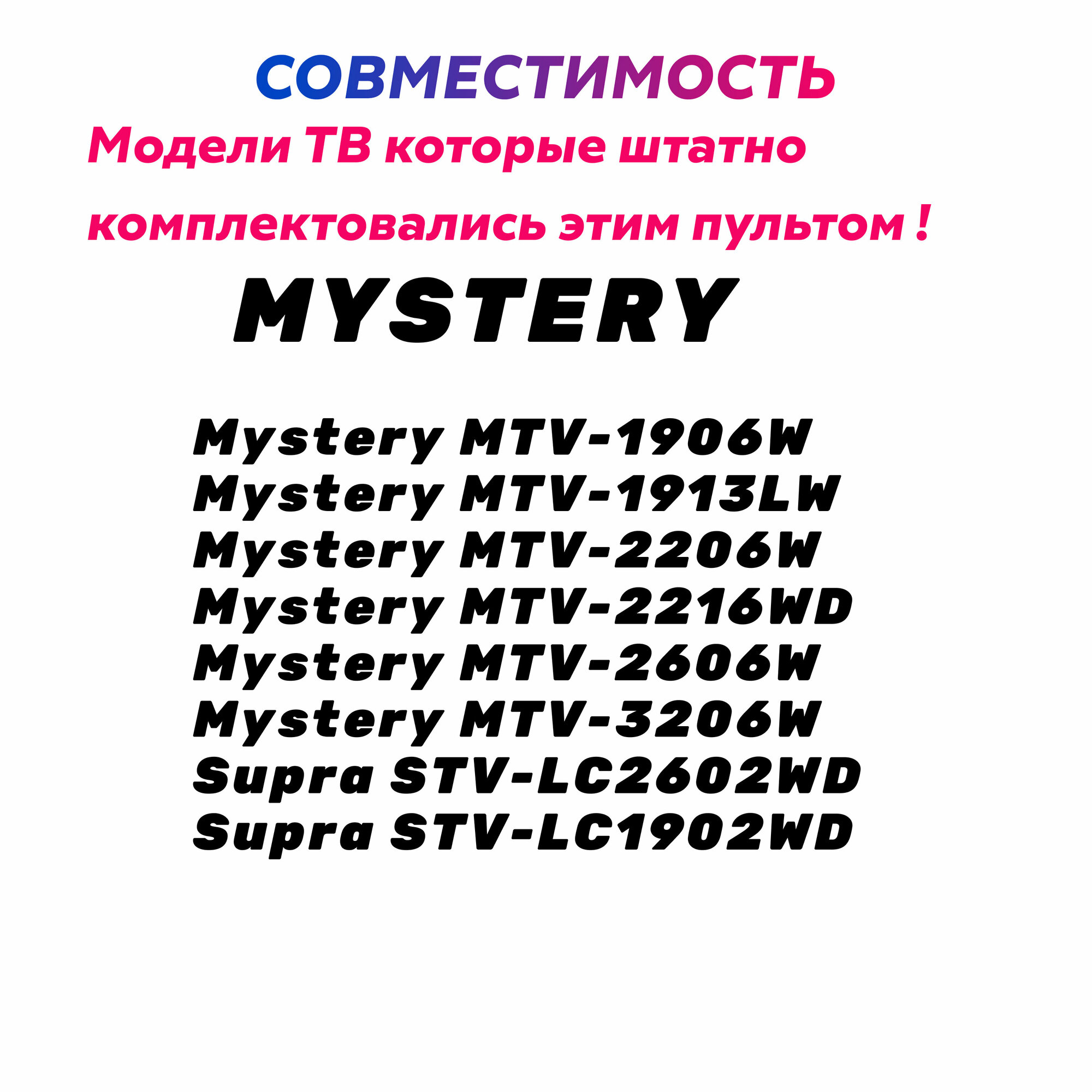 | Дополнительная информация | пульт для телевизора MYSTERY MTV-1906W * пульт для телевизора MYSTERY MTV-1913LW * пульт для телевизора MYSTERY MTV-2206W * пульт для телевизора MYSTERY MTV-2216WD * пульт для телевизора MYSTERY MTV-2606W * пульт для телевизора MYSTERY MTV-3206W * пульт для телевизора SUPRA STV-LC2602WD * пульт для телевизора SUPRA STV-LC1902WD |