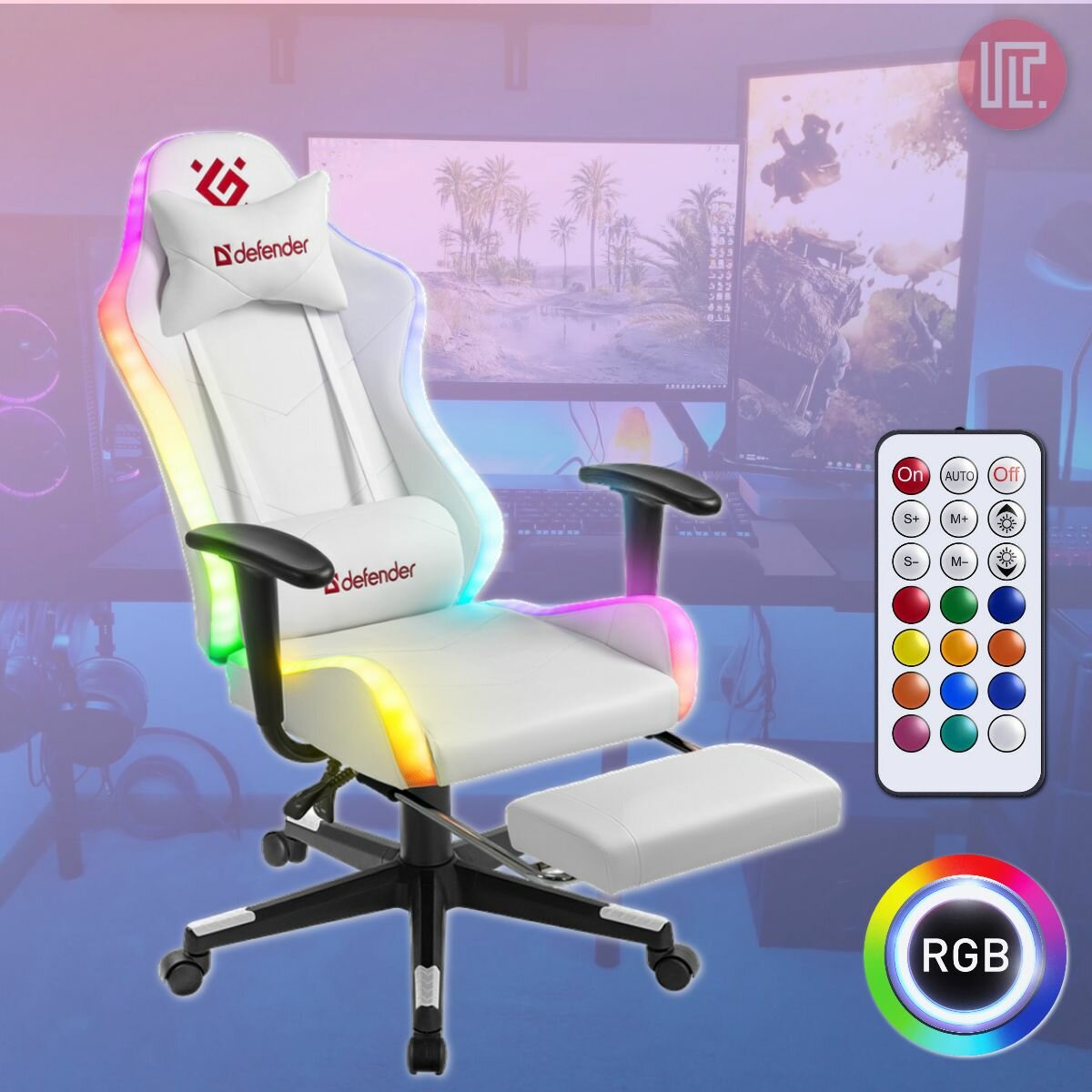 Игровое кресло / компьютерное кресло Defender Watcher белый, RGB подсветка + пульт, полиуретан, 2 подушки и подставка для ног