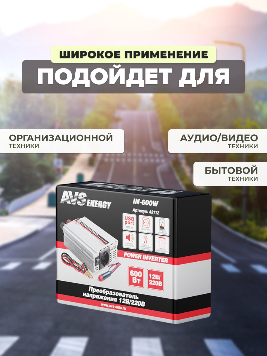 Преобразователь напряжения 12/220V, инвертор автомобильный AVS IN-600W, 43112
